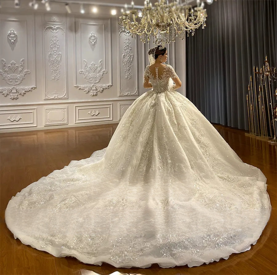 Make a grand entrance in our Hot Sale Luxury Princess Ball Gown Wedding Dress with elegant long sleeves and delicate lace detailing, designed for brides who dream of a regal, timeless look. Crafted from premium fabrics, this exquisite gown combines comfort and royal charm to create unforgettable bridal moments and a fairy-tale wedding experience.