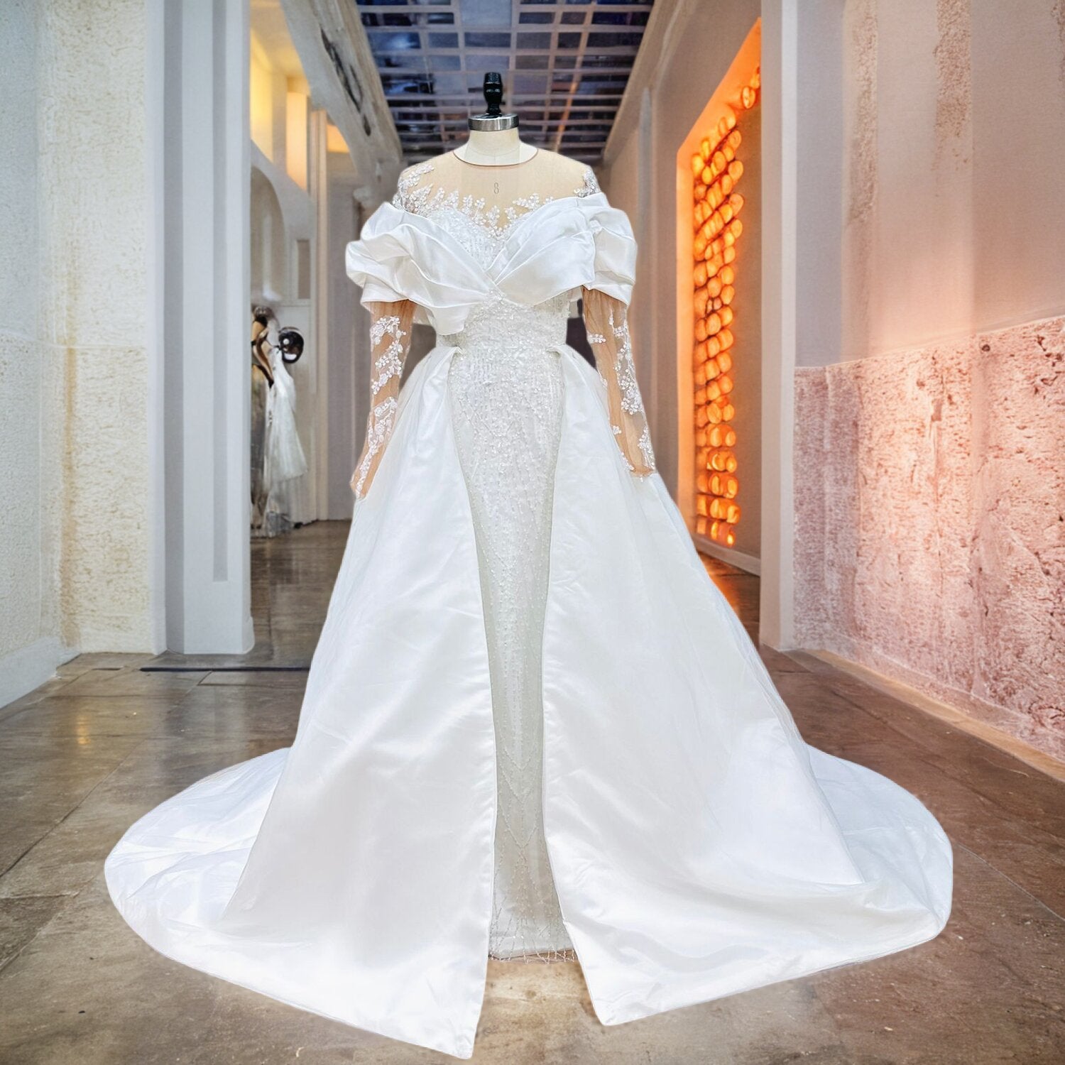 Experience timeless elegance with this Long Sleeve Mermaid Wedding Dress, featuring intricate beading appliques and a flattering silhouette that highlights your curves. The detachable train adds versatility, seamlessly blending classic charm with modern sophistication for an unforgettable bridal look.