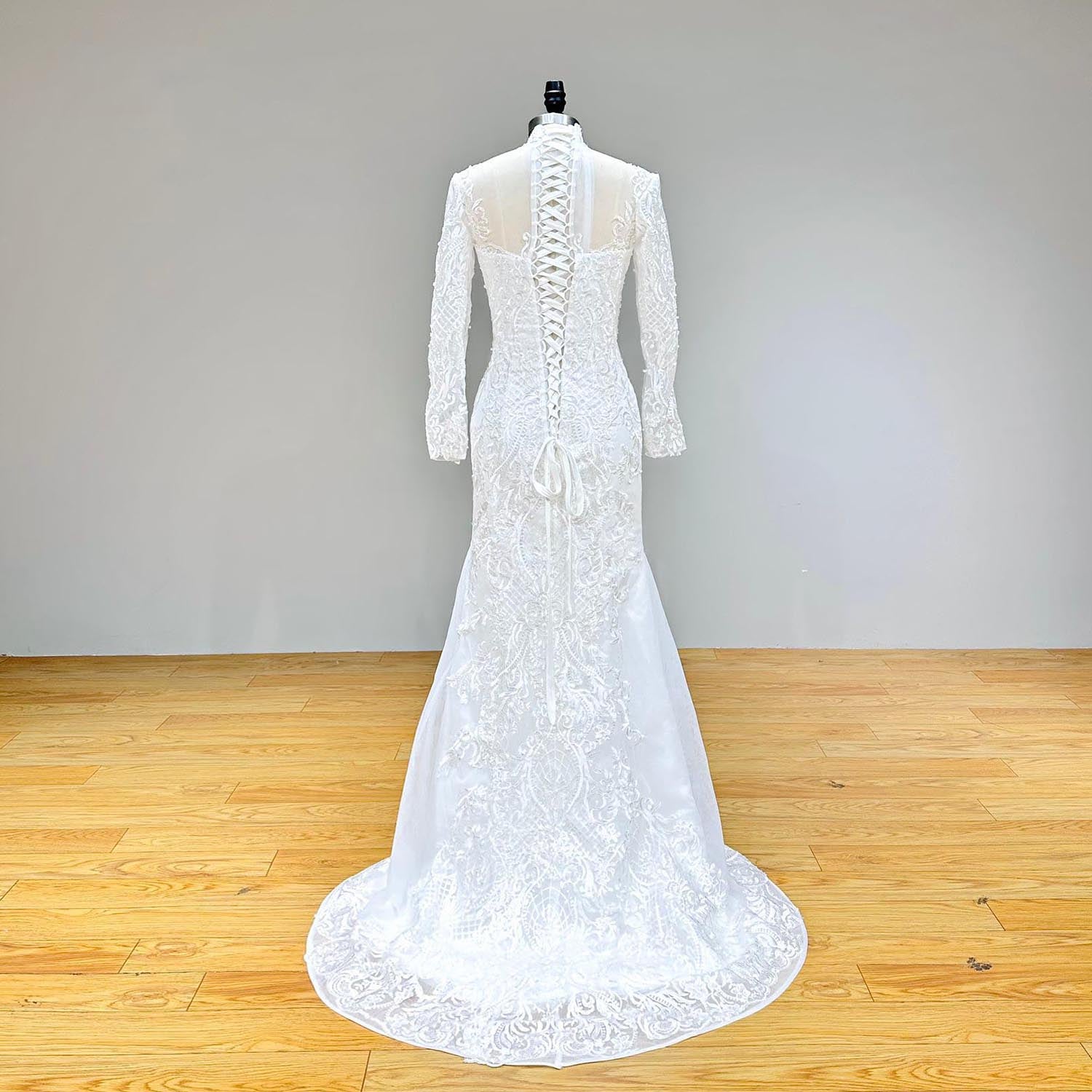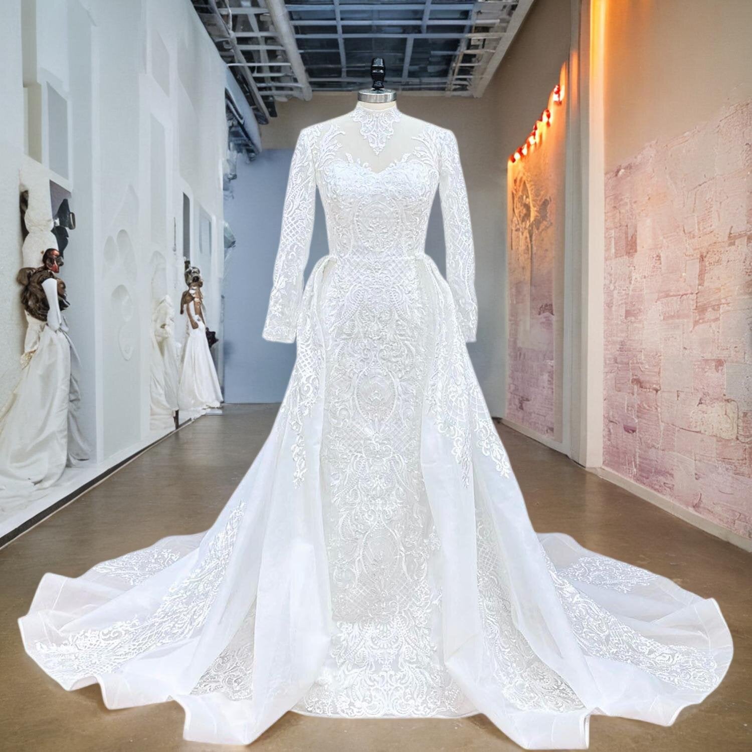 Experience timeless elegance in our Long Sleeve Mermaid Wedding Dress, with pearl details and a detachable train for graceful versatility. This luxurious gown hugs your curves beautifully, blending classic charm with modern sophistication.
