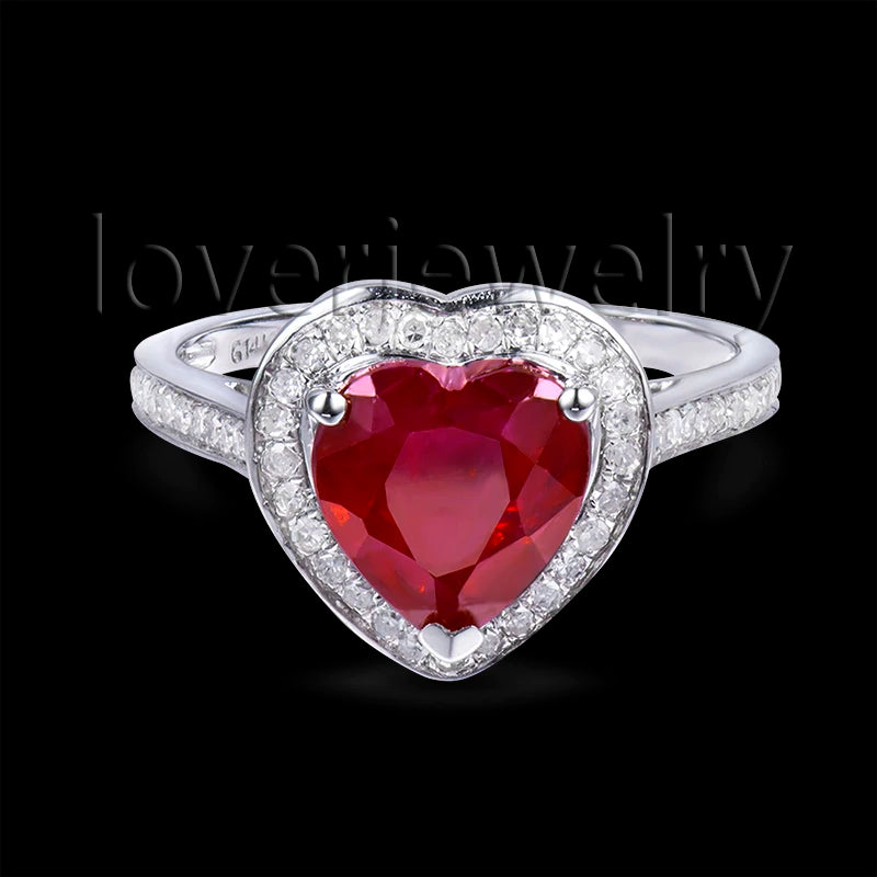Genuine 8x8mm Heart Ruby Ring 14K White Gold Diamond