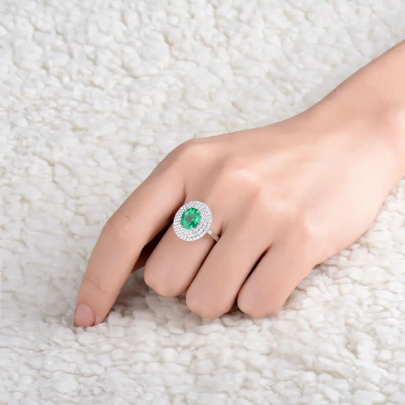 Green Emerald Oval Cut Ring 14K White Gold Diamond Anniversary Jewelry Gift