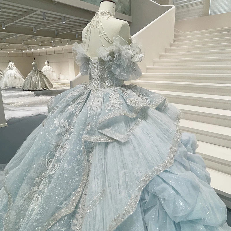 Experience timeless elegance in the Luxury Lace Ball Gown Halter Wedding Dress, featuring delicate lace, customized embroidery, and a voluminous fairy-tale silhouette. Designed for unforgettable moments, this exquisite gown combines romantic style, premium craftsmanship, and a flattering halter neckline.