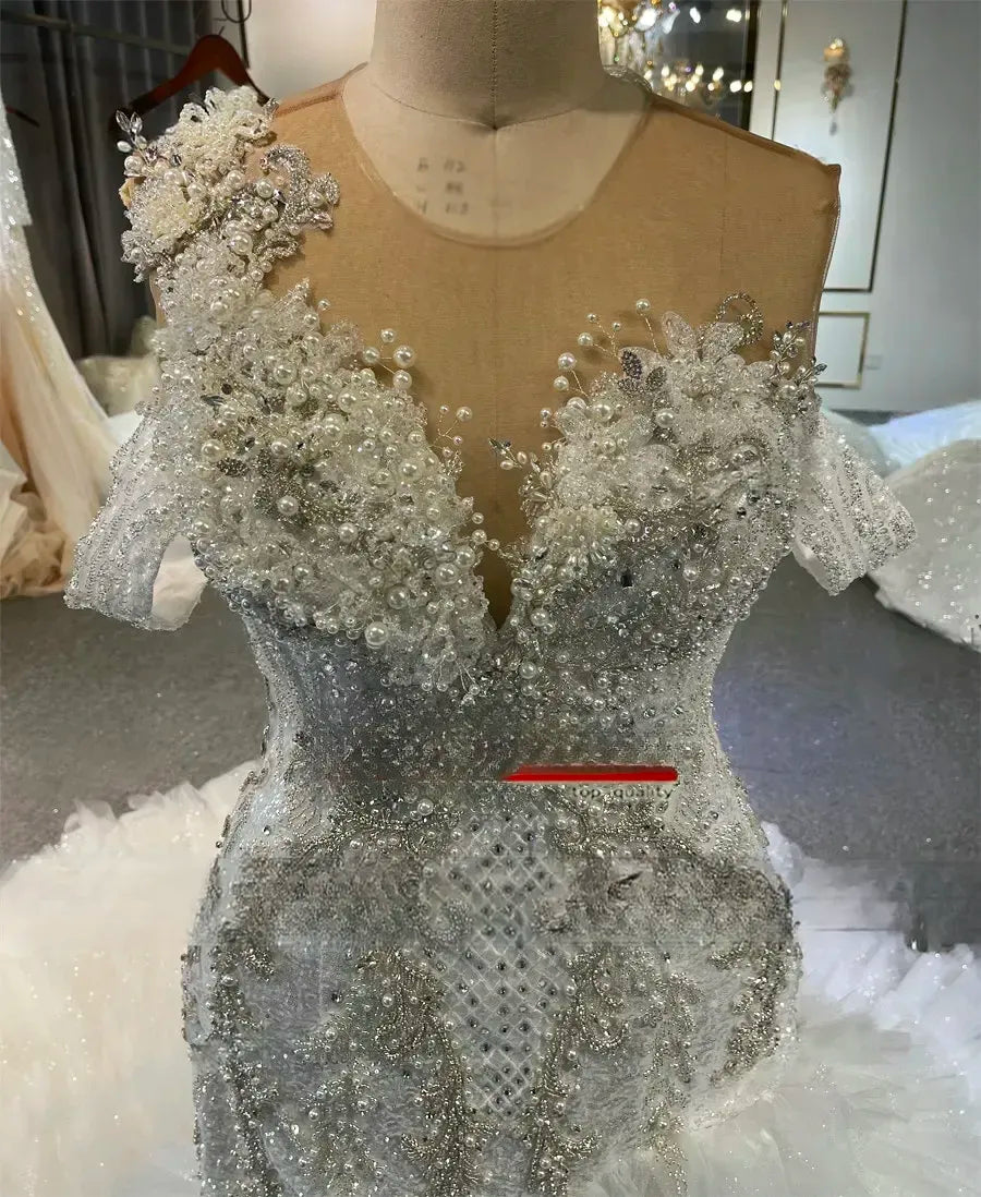 Make a bold statement with this luxury off-the-shoulder mermaid wedding dress featuring a dramatic slit and a flowing ballgown skirt that blends timeless elegance with modern glamour. Crafted with delicate lace, beading, and premium fabrics, it flatters your curves and offers comfort for a breathtaking bridal look.