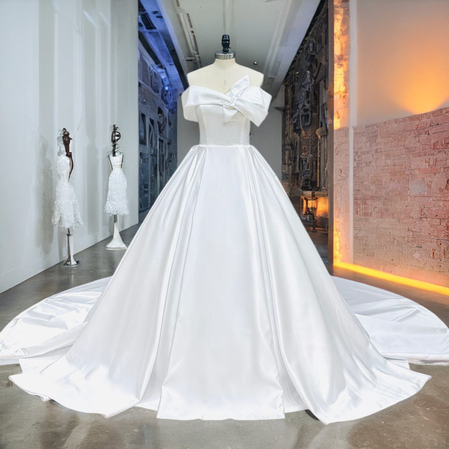 This Luxury Satin Ball Gown Wedding Dress features a graceful V-neckline and a vintage-inspired lace-up back, blending timeless elegance with romantic charm. Its voluminous skirt and lustrous satin fabric create a regal silhouette, making it the perfect choice for brides seeking a fairytale look.