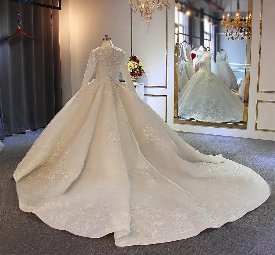This Muslim wedding dress features long sleeves and full lining, blending modesty with timeless elegance. Perfect for brides seeking a graceful and sophisticated bridal gown for their special day.