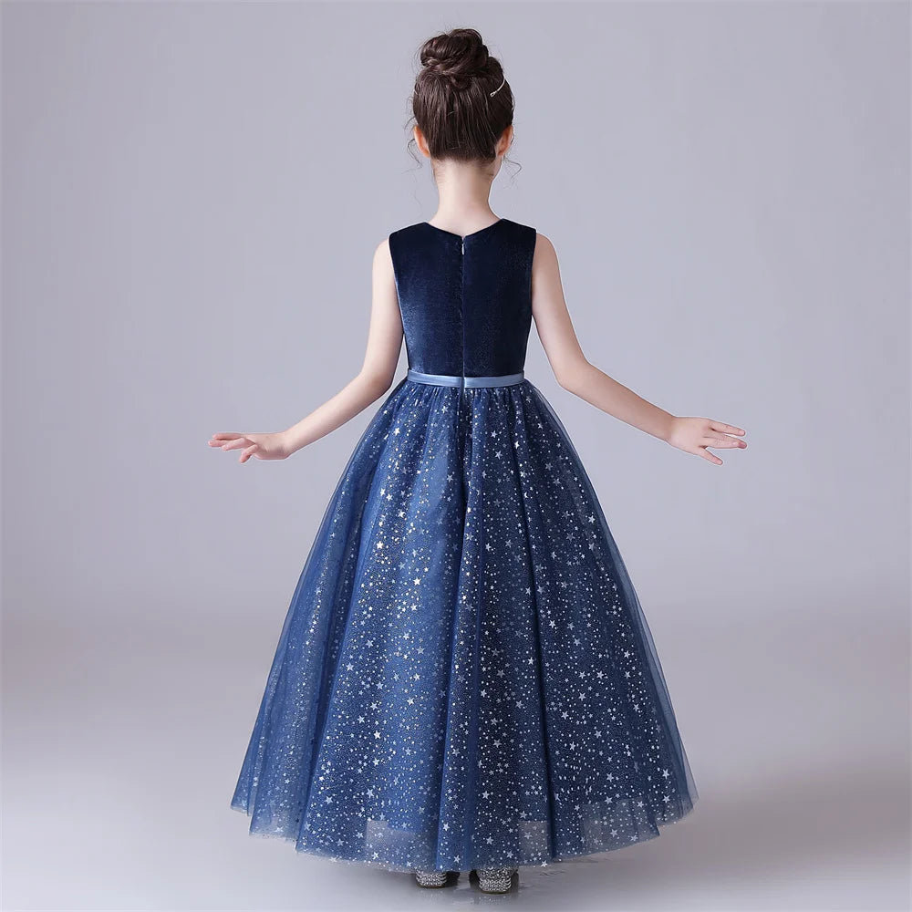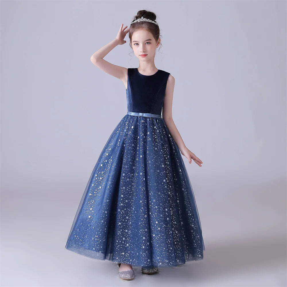 Navy Blue Shiny Tulle Flower Girl Dress Sleeveless Birthday Formal Princess Gown for Kids