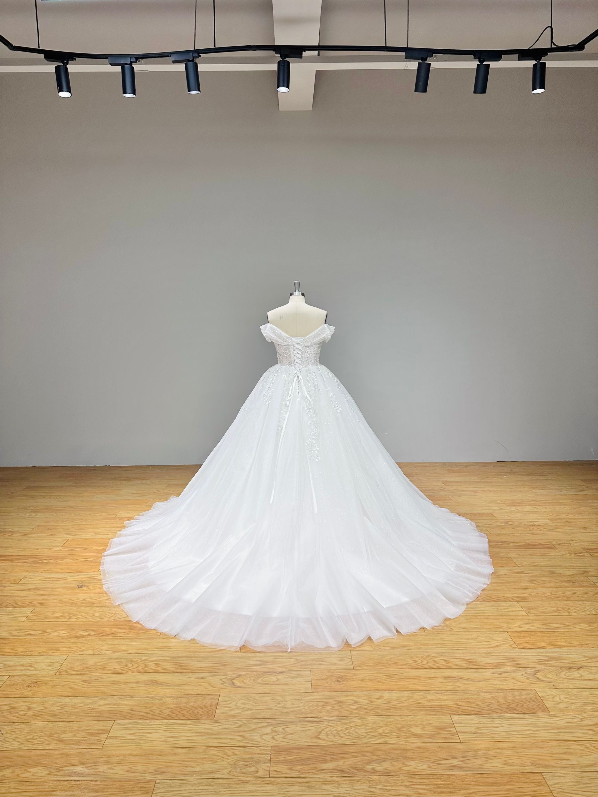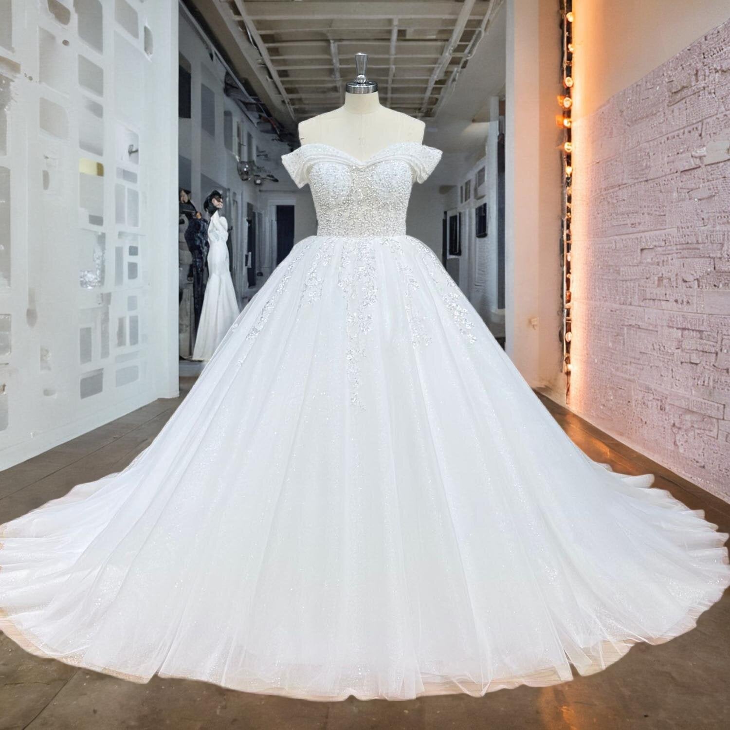 New Arrival Off Shoulder Ball Gown Wedding Dress with Beading Pearls Lace Up Back