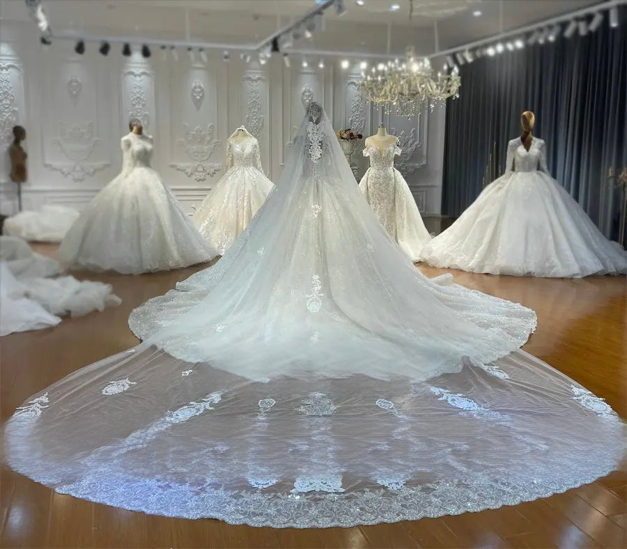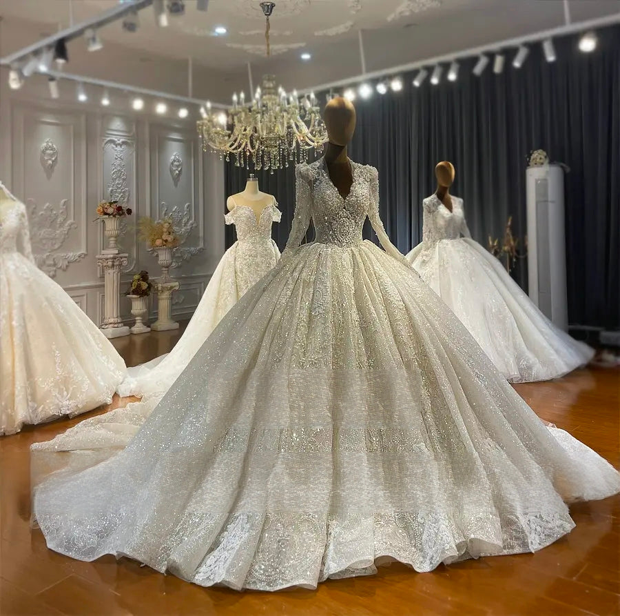 This new model lace bridal dress features a romantic V-neckline that beautifully enhances the bride’s elegance. Designed with delicate lace details and a graceful silhouette, it perfectly blends modern charm with timeless sophistication.