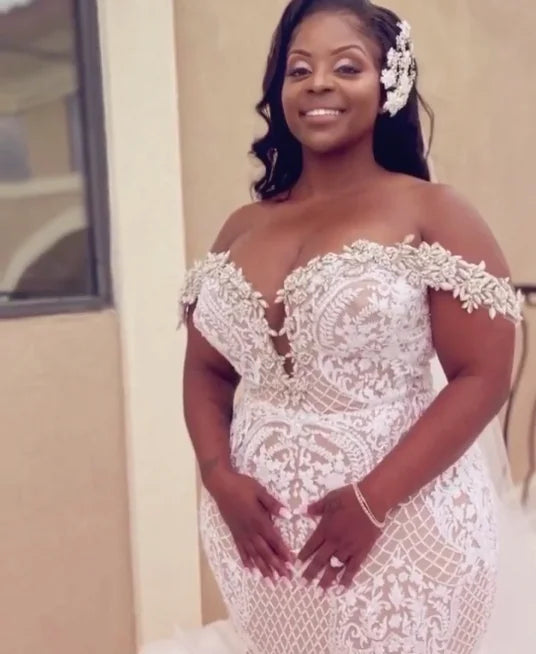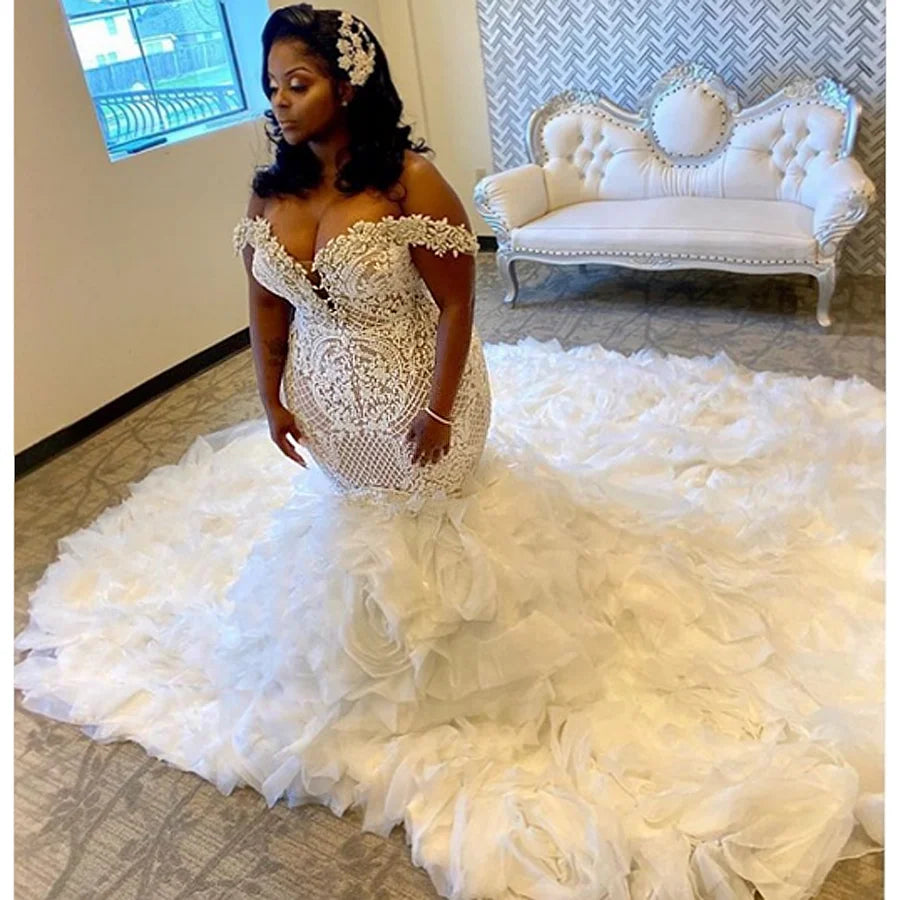 Off Shoulder Mermaid Wedding Dress with Ruffle Skirt Luxury Ball Gown
