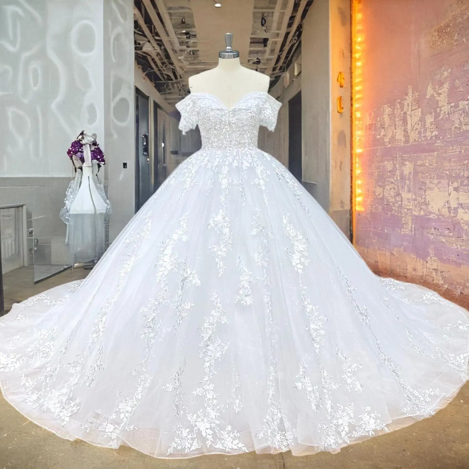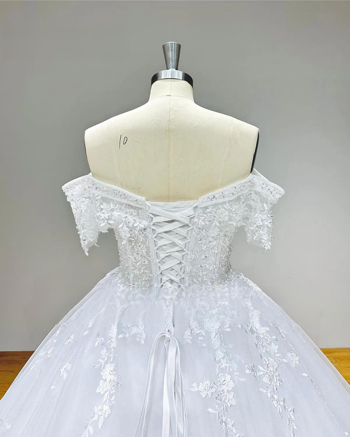 Off Shoulder Sequin Beaded Ball Gown Wedding Dress with Lace-Up Back