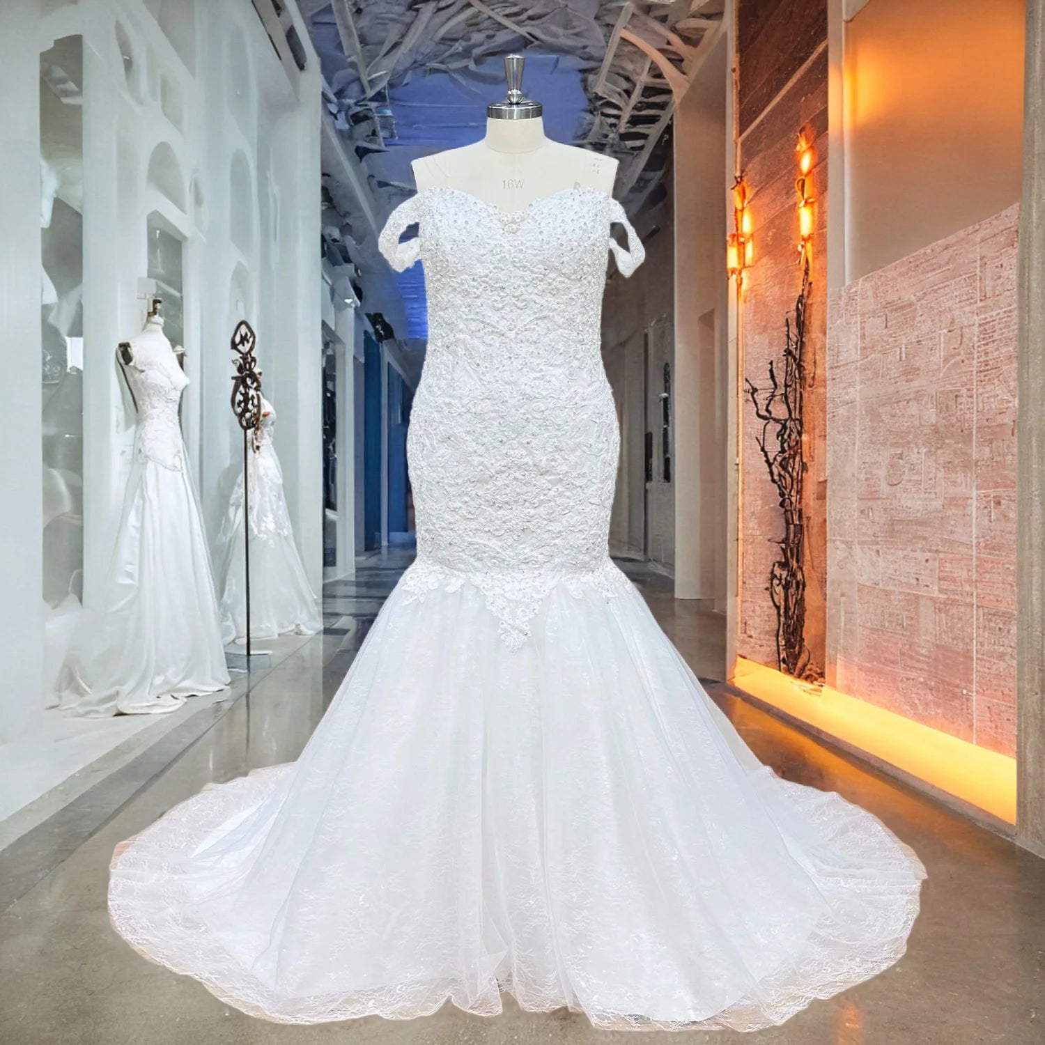 Make a breathtaking entrance in this off-shoulder tulle mermaid wedding dress, where timeless elegance meets modern charm. Adorned with intricate beading and flowing tulle, this gown ensures a romantic, unforgettable look from every angle.