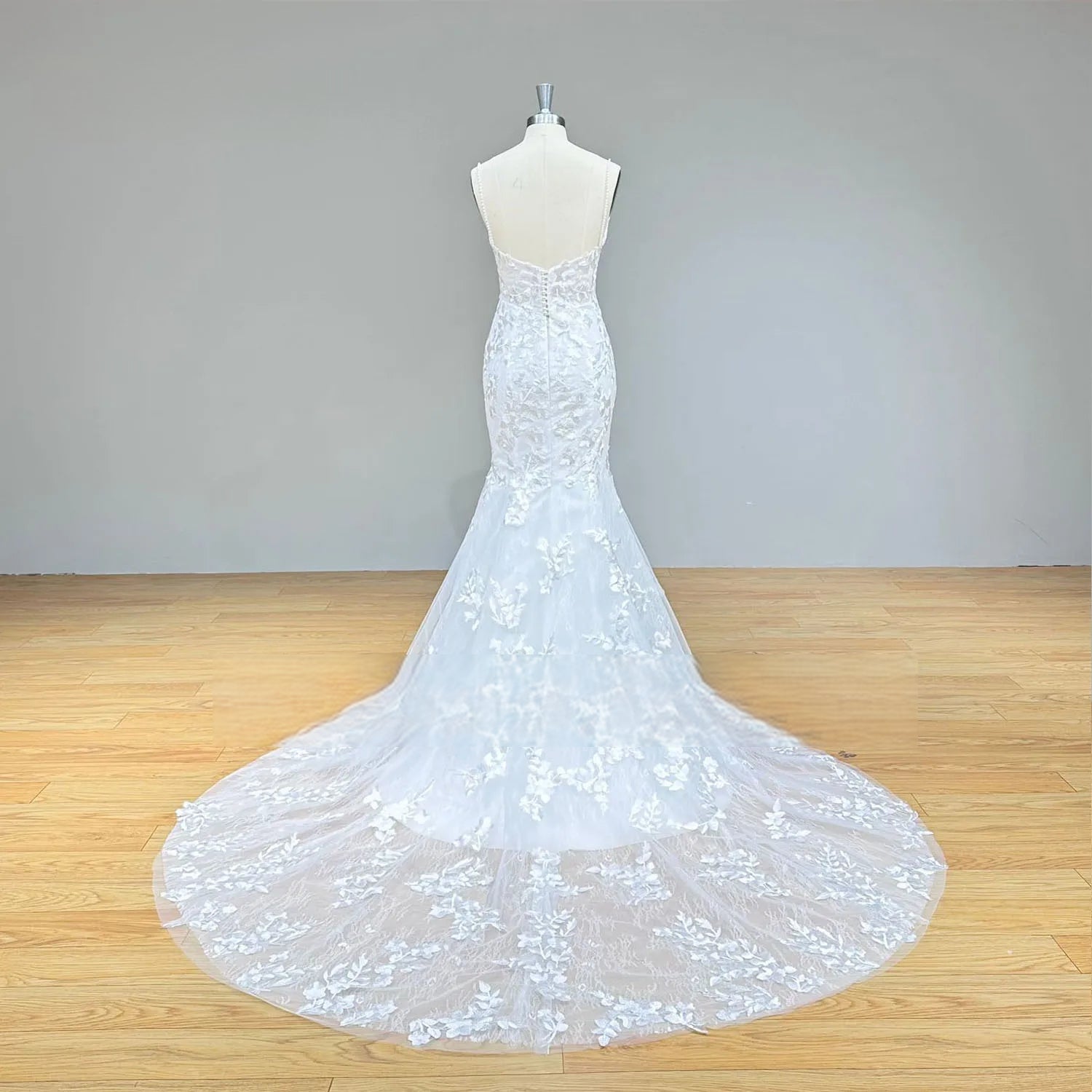 Pearl shoulder straps and a sweetheart neckline elevate this lace applique mermaid wedding dress with timeless elegance. The backless design and flowing train add a touch of modern romance.