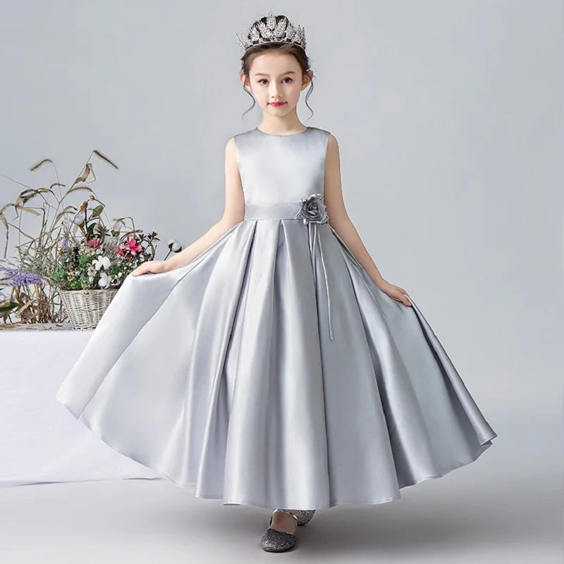 Satin Long Flower Girl Dress Elegant Wedding Party Gown Pageant