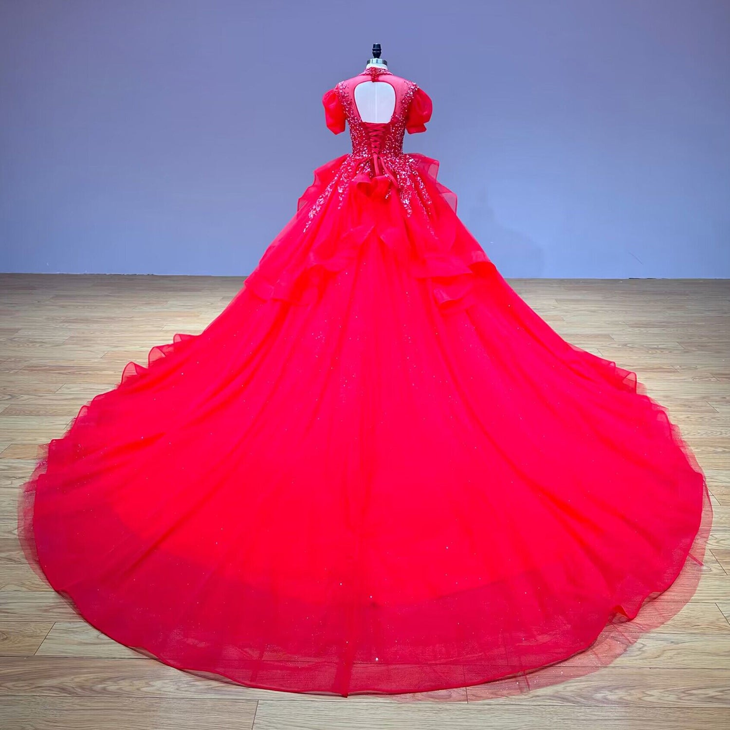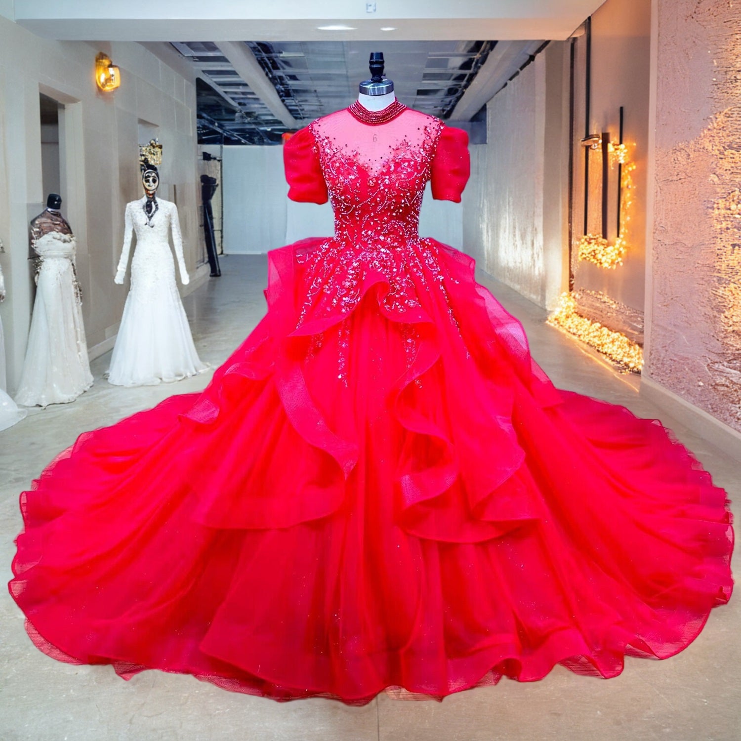 The New Arrival Sequined Ball Gown Wedding Dress combines shimmering sequins, delicate 3D flowers, and a flattering high-neck design for a modern, elegant look. Perfect for making a dramatic, unforgettable statement, this gown ensures comfort and timeless beauty on your special day.