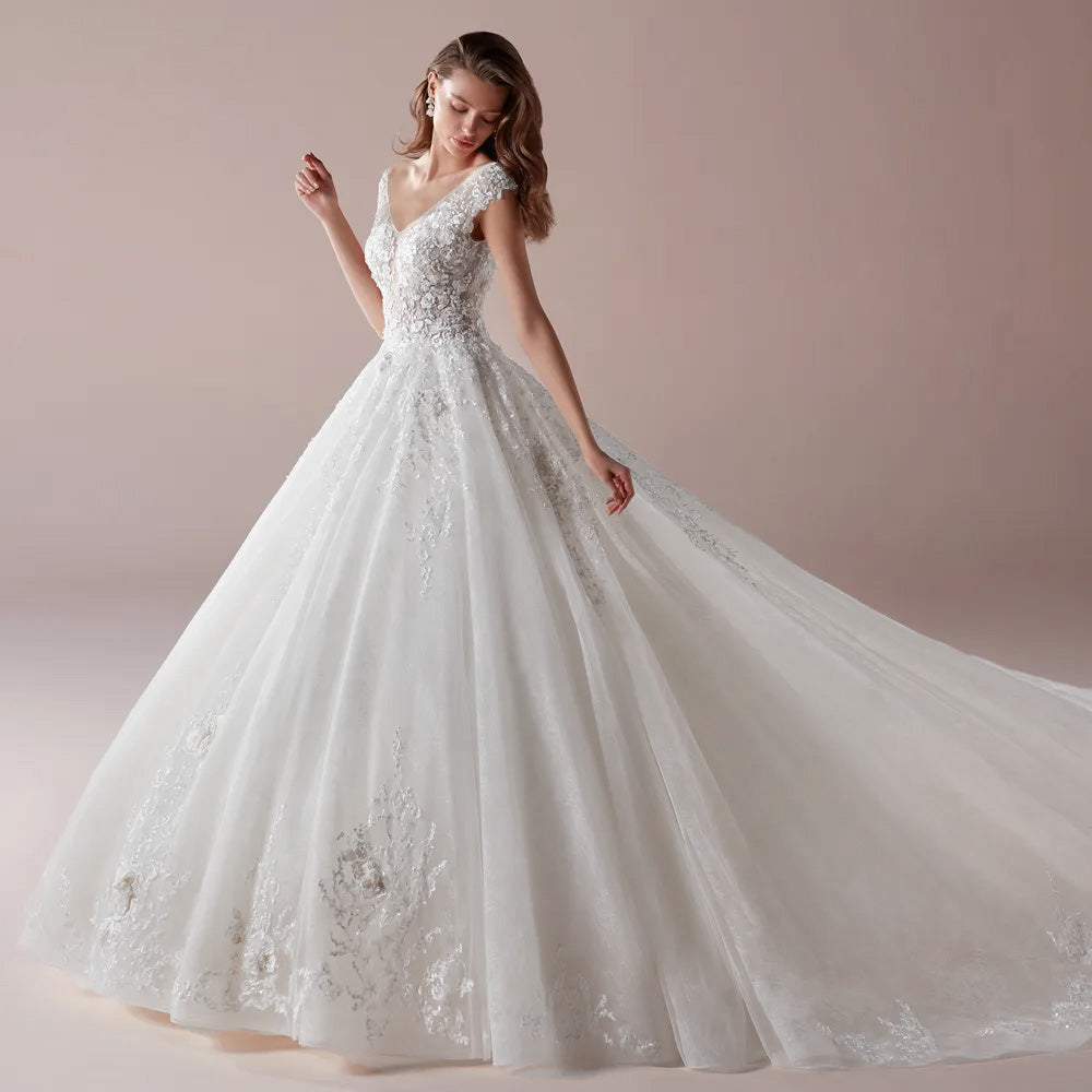 Sexy Backless V Neck Lace A-Line Wedding Dress Elegant Appliques Flowers Chapel Train