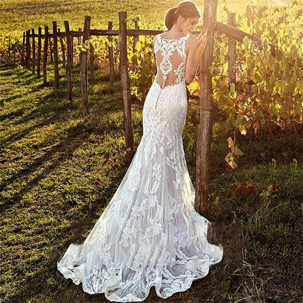 Sexy V-Neck Mermaid Wedding Dress Lace Boho Sleeveless Bridal Gown Pleats Illusion Back