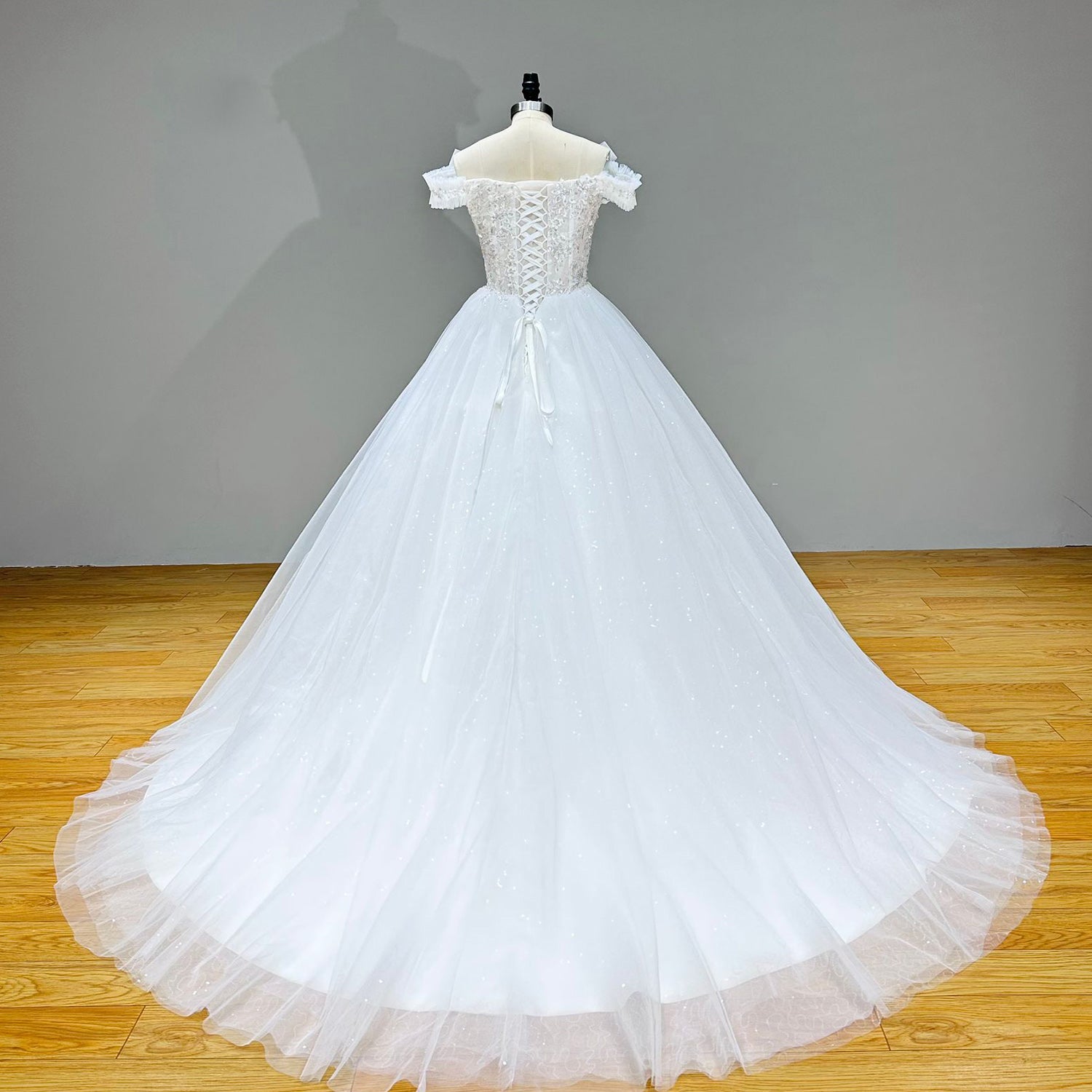 This Shining Sequined Beaded Off-the-Shoulder Princess Wedding Dress features sparkling beadwork, a dramatic train, and a voluminous silhouette for a royal look. Perfect for modern brides, it combines timeless elegance with a flattering custom fit.