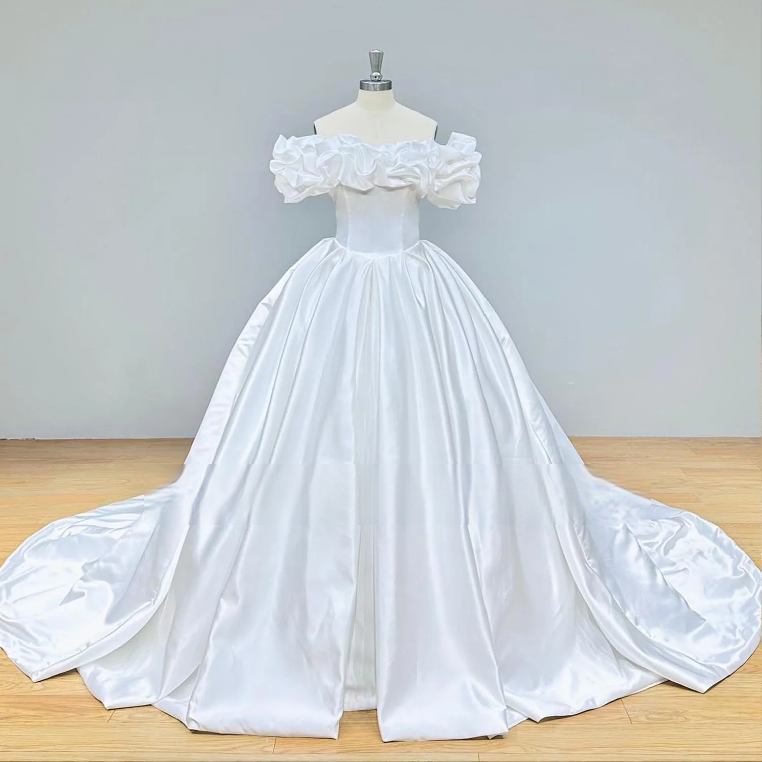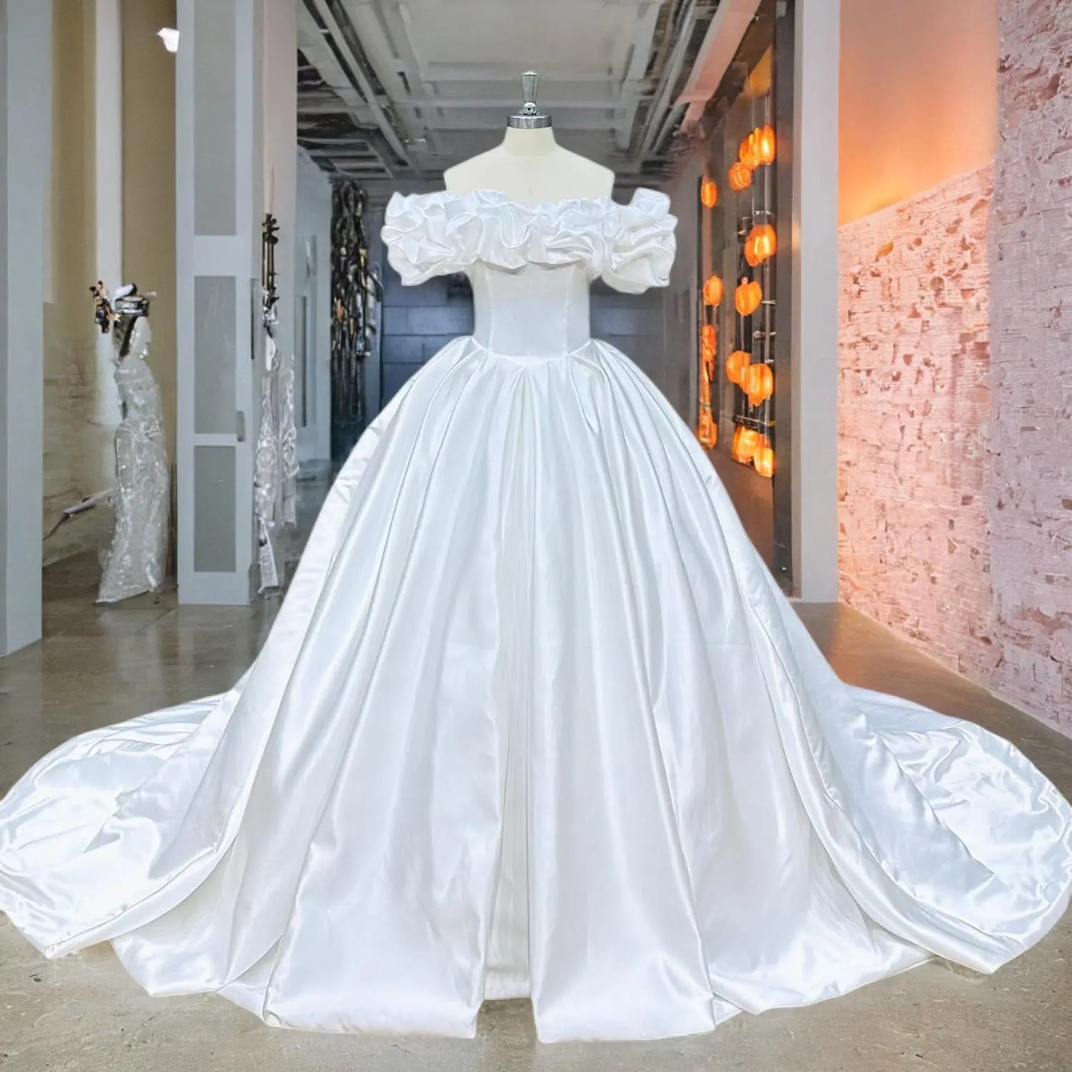 Embrace timeless elegance with this short sleeve satin ball gown wedding dress by Elsi John, featuring a smooth matte finish, fitted bodice, lace-up back, and voluminous skirt for a regal silhouette. Crafted from high-quality satin, it blends classic charm with modern sophistication—perfect for brides seeking comfort, grace, and unforgettable style.