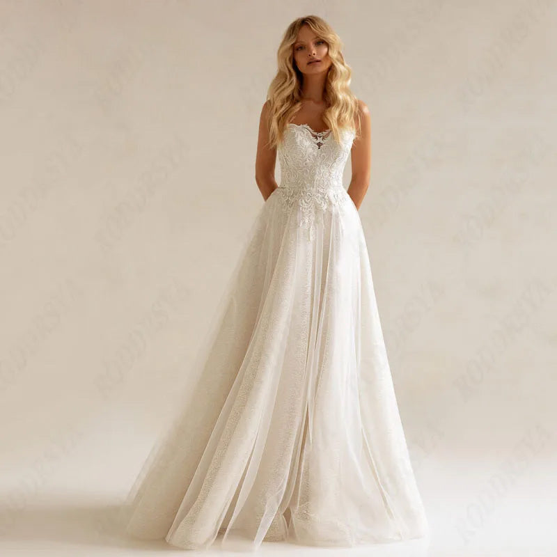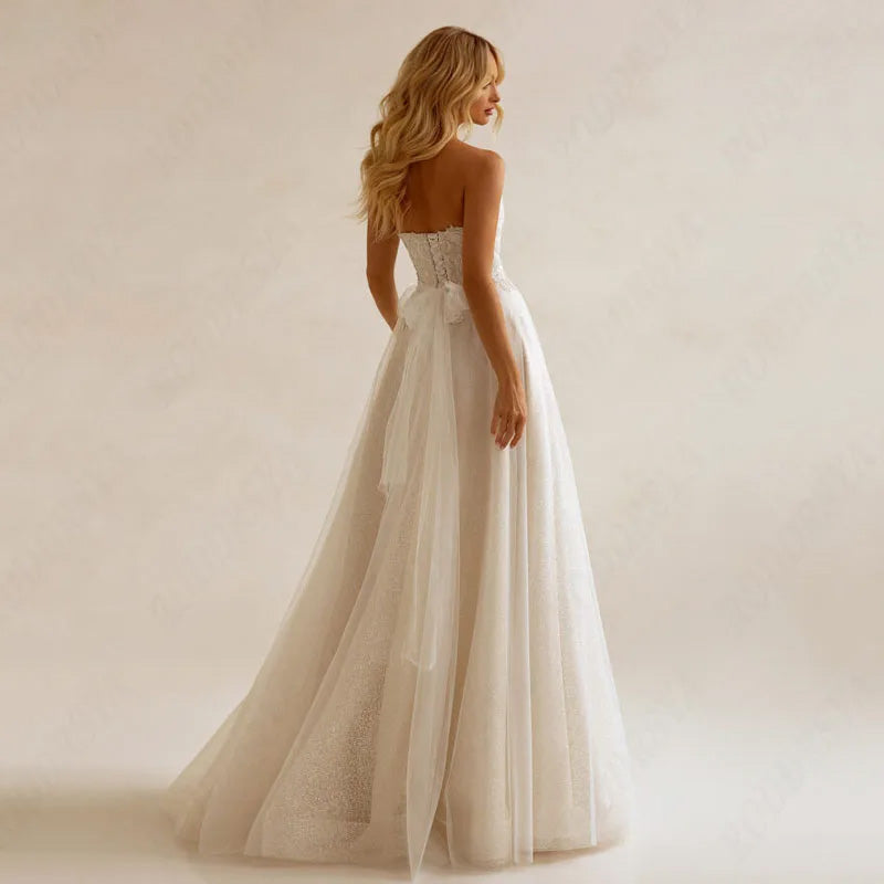 Strapless Lace A-Line Wedding Dress Shining Tulle Boho Lace Up Backless Bridal Dress