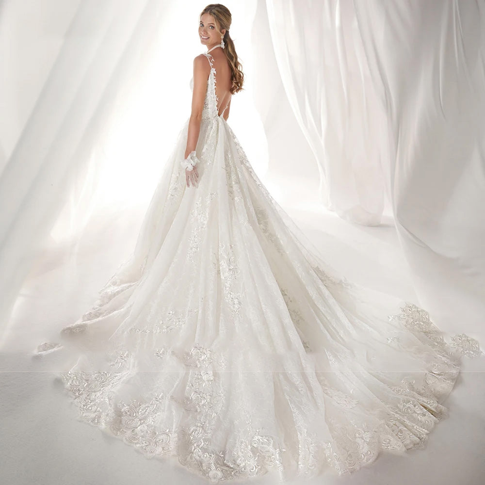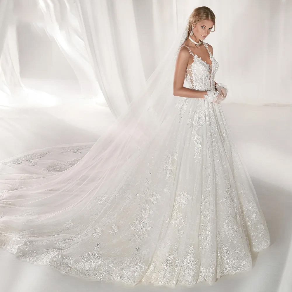 Elsi John's Sweetheart Lace A-Line Wedding Dress features a backless design with delicate appliques, beading, and elegant spaghetti straps. This boho-inspired gown blends timeless elegance and modern charm for an unforgettable bridal look.