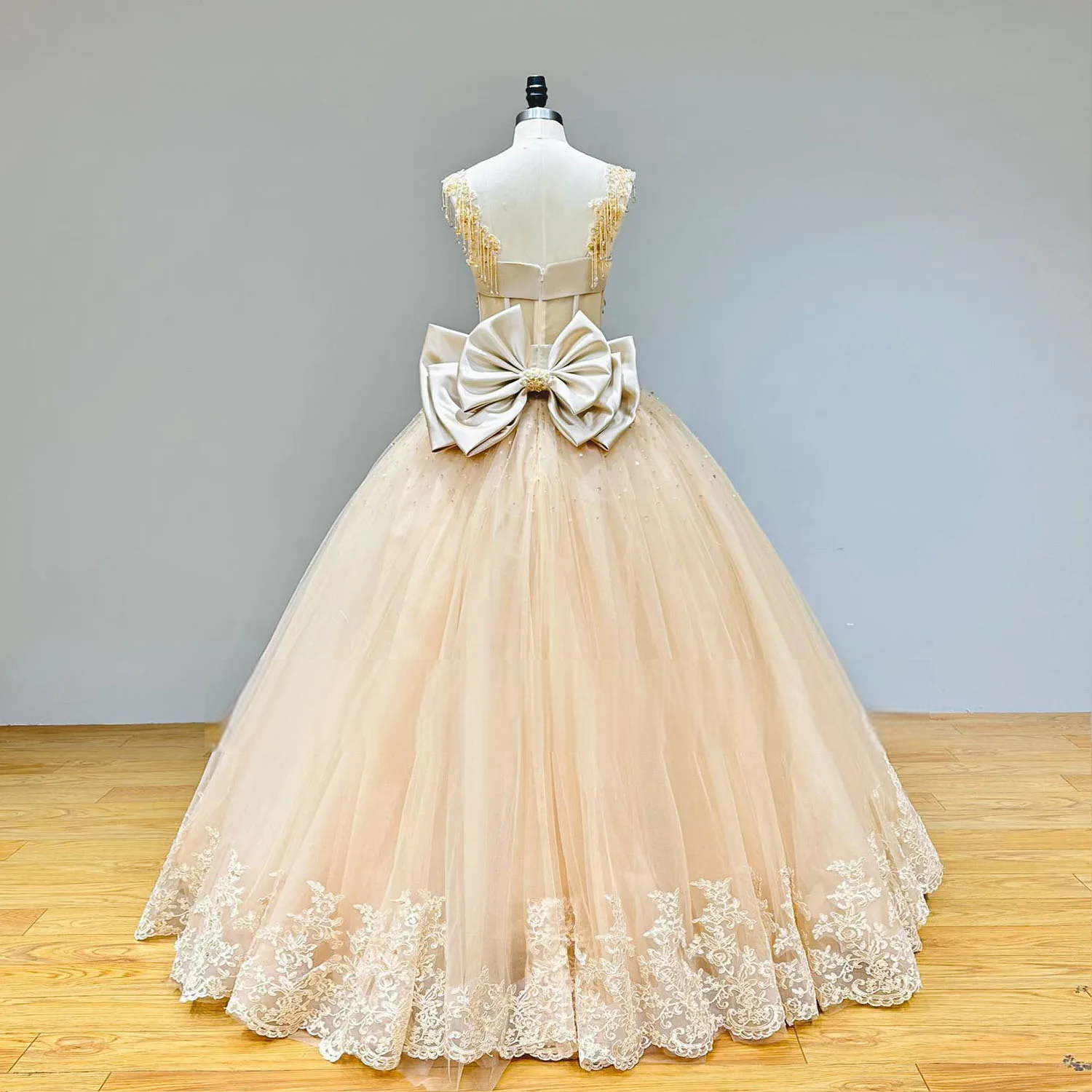 Sparkle with elegance in this sweetheart neck gown featuring crystal beading, delicate straps, and a romantic bow back. Perfect for weddings, proms, or formal soirées, it flatters every silhouette with timeless charm.