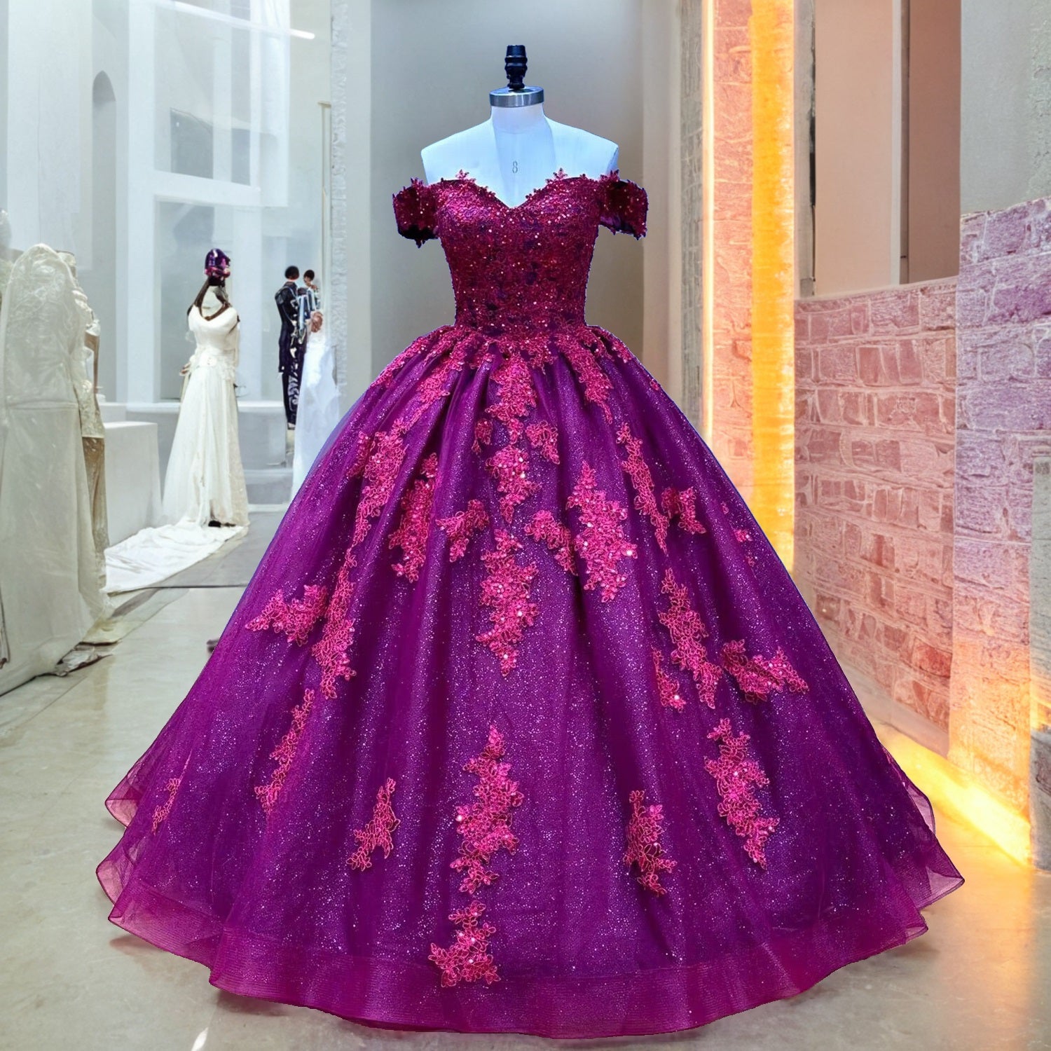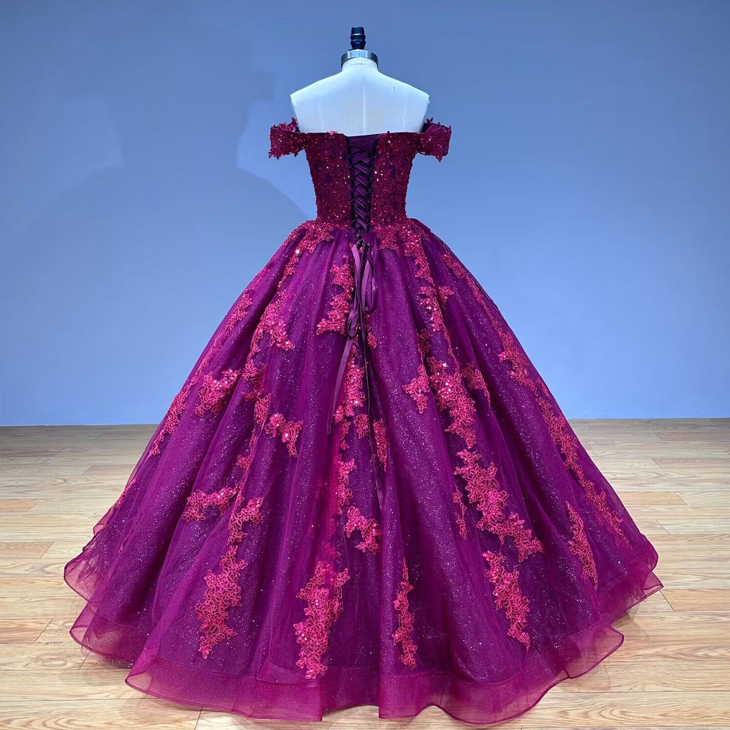This elegant burgundy quinceañera dress showcases a flattering sweetheart neckline, short sleeves, and exquisite beading for a royal look. The lace-up back and rich detailing ensure a perfect fit, blending tradition with modern glamour.