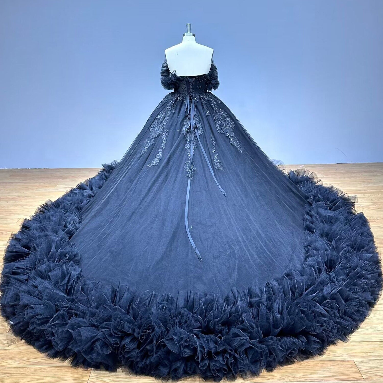 The RTulle Ball Gown Wedding Dress features layered tulle, a corset back, and a flowing chapel train, creating a romantic and elegant silhouette. Its timeless design blends classic charm with modern style, perfect for any fairytale wedding.