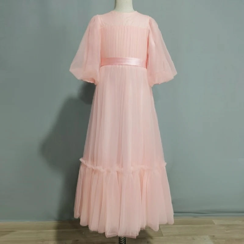 Tulle Flower Girl Dress with Puff Sleeves, Ruffles, and Sashes - Floor-Length Gown