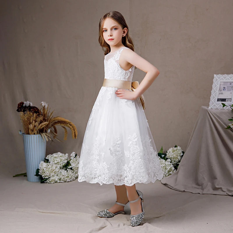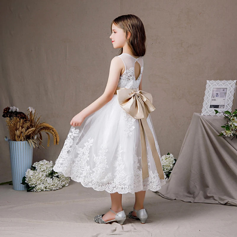 Tulle Sleeveless Big Bow Tea-Length Flower Girl First Communion Dress