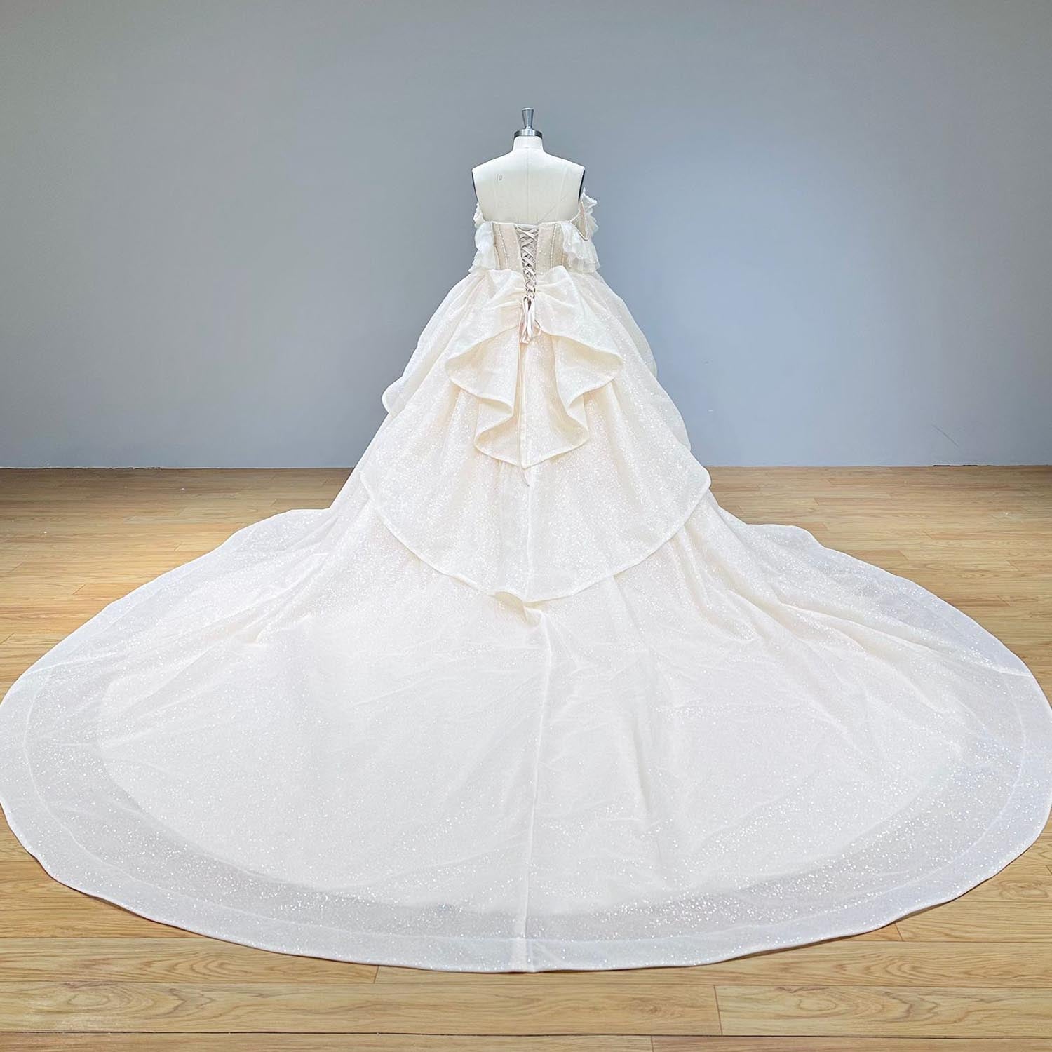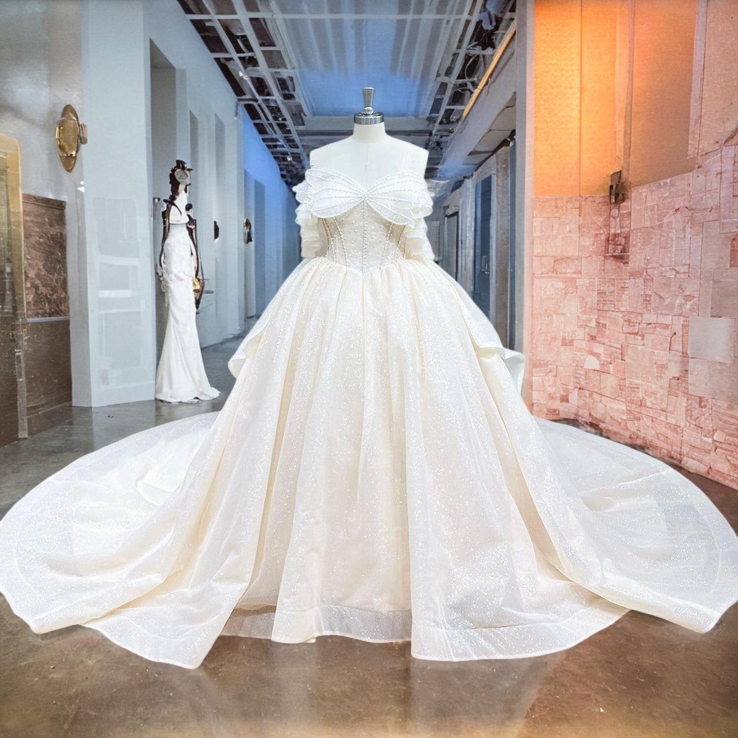 Embrace elegance and sparkle in this Pearl Bow Glitter Ball Gown Wedding Dress, featuring a romantic off-shoulder neckline and shimmering tulle layers. A pearl-embellished bow and lace details add timeless charm, perfect for your dream wedding.