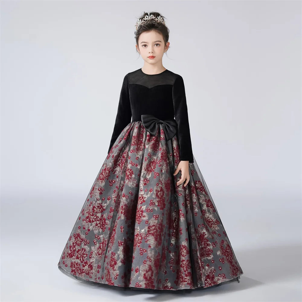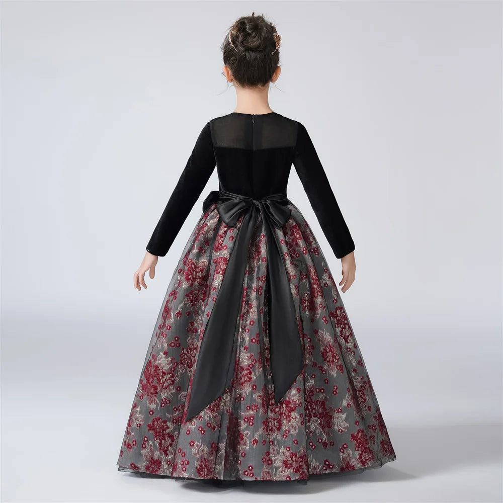 Vintage Velvet Long Sleeve Girls Dress Party Pageant Gown