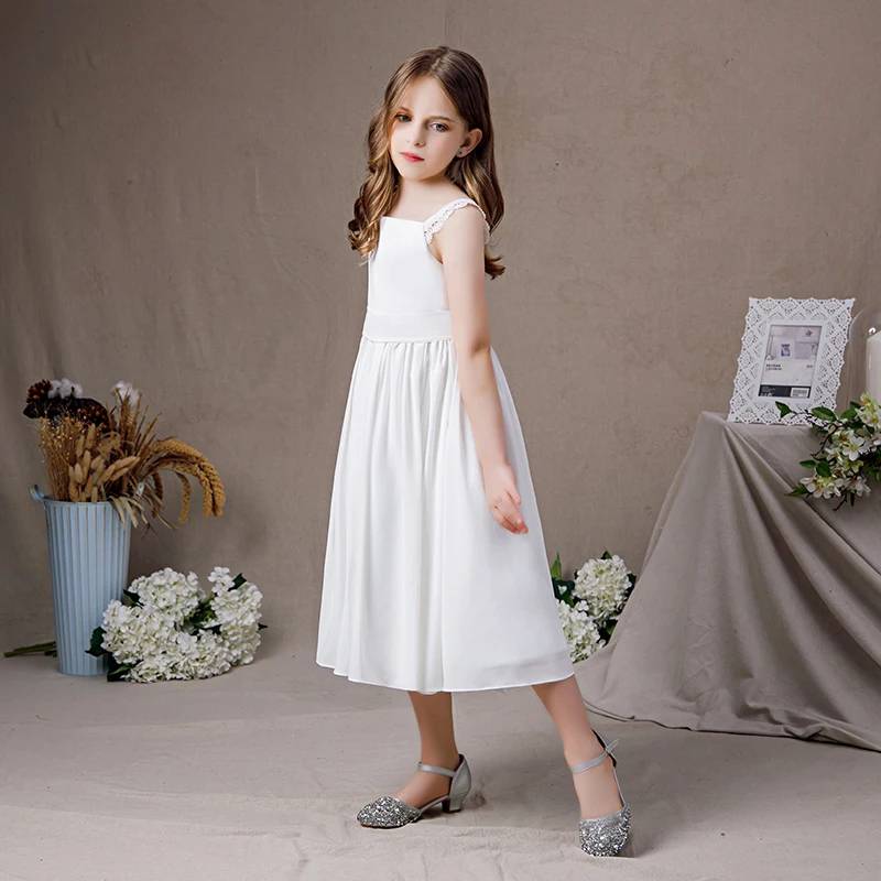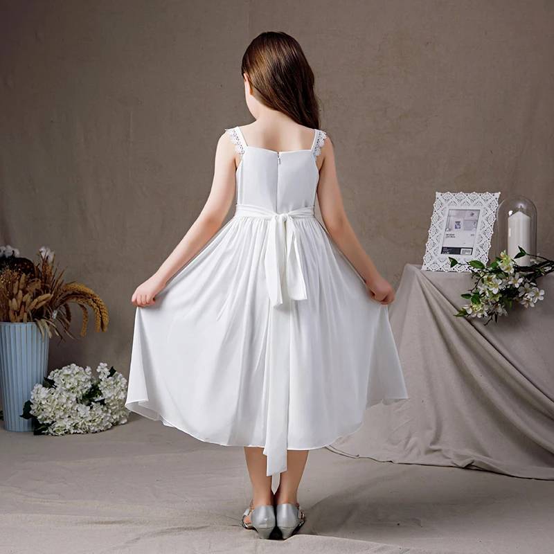 White Chiffon Sleeveless Girls Dress for Communion Birthday or Bridesmaid