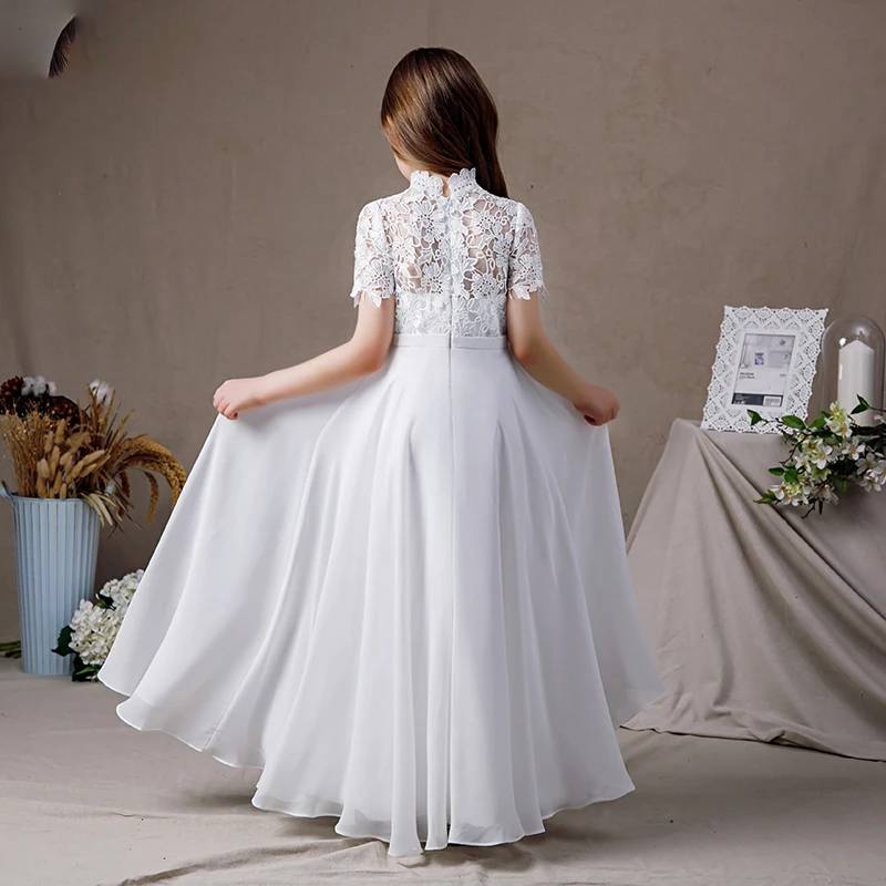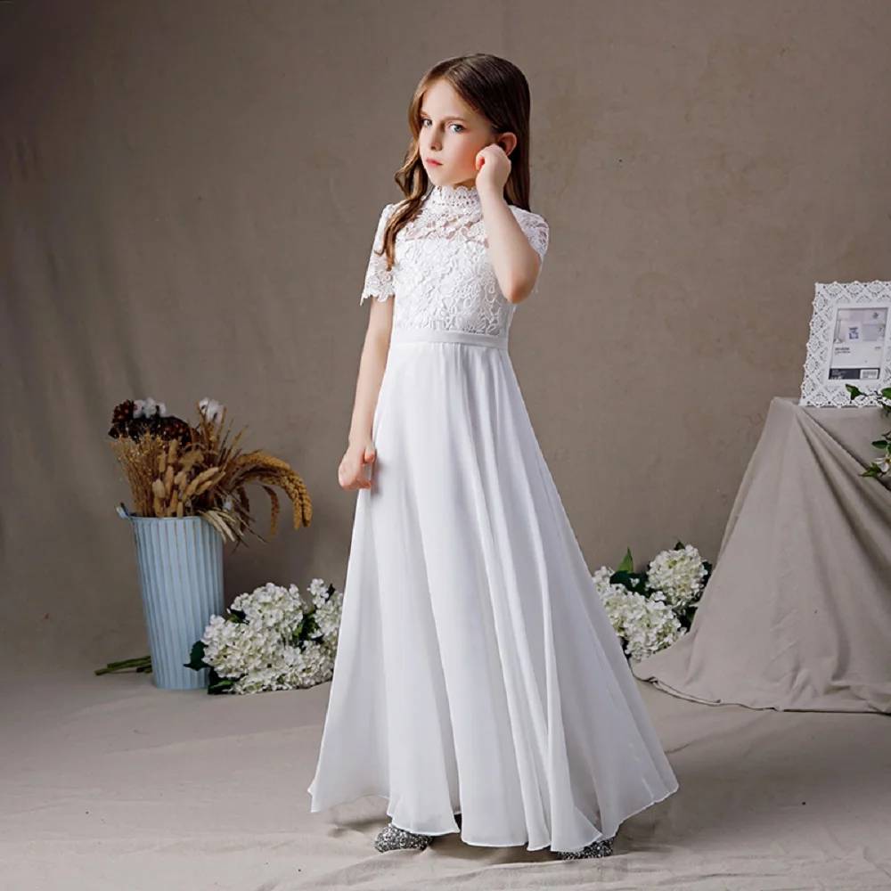 White High Neck Chiffon Lace Dress for First Communion, Junior Bridesmaid, or Party