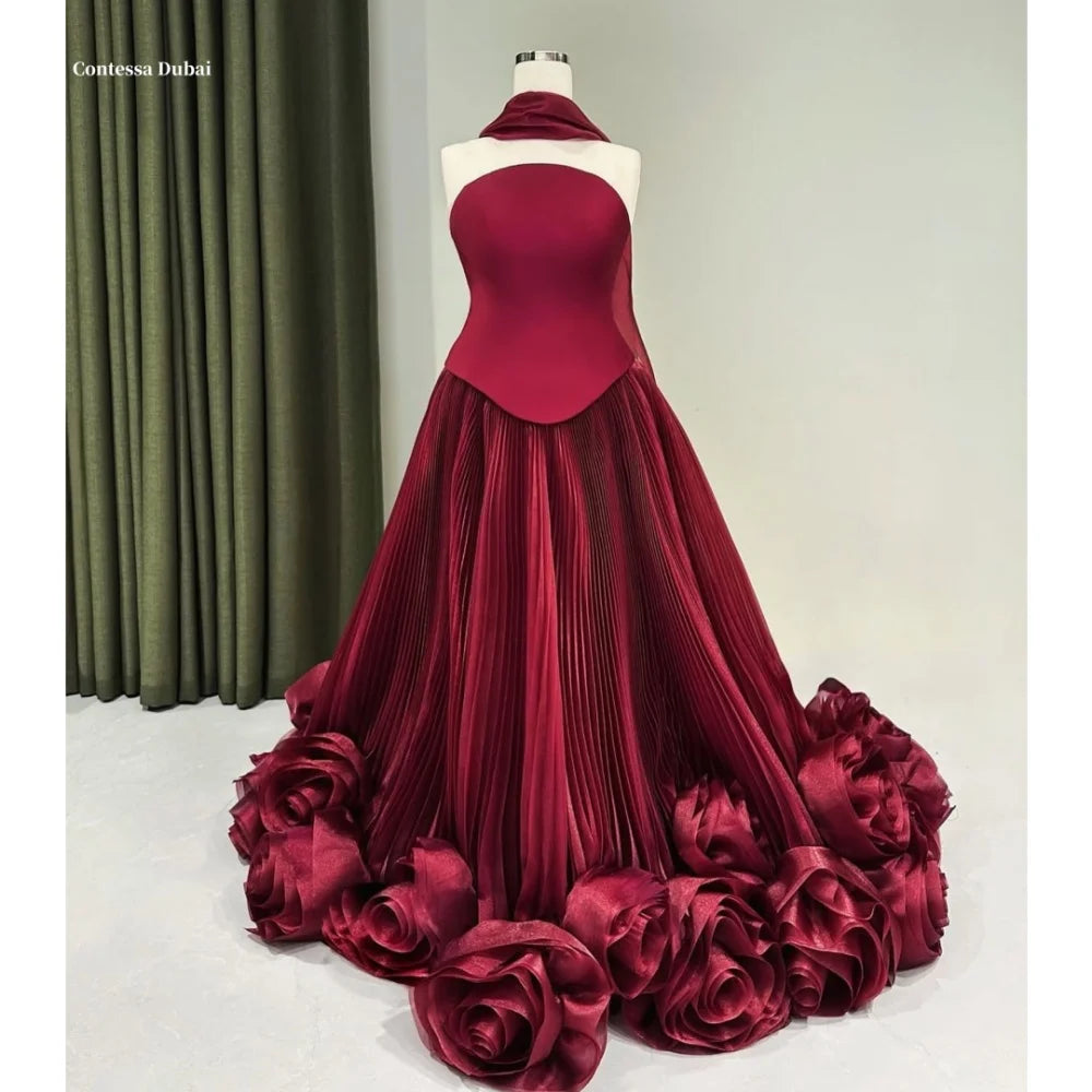 3D Flowers Satin A-Line Wedding Dress Strapless Sleeveless Elegant Evening Gown