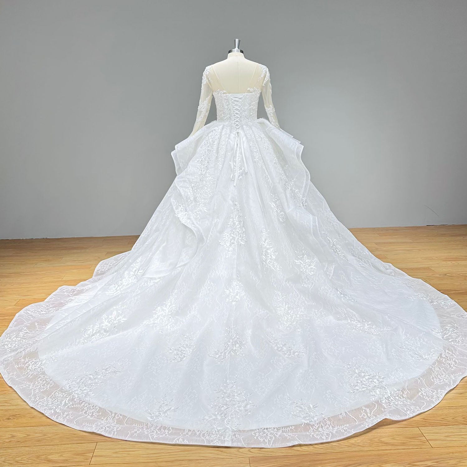 The Beaded Lace Ball Gown Wedding Dress with Long Sleeves combines vintage-inspired beaded lace and a full skirt for timeless elegance. This gown blends classic beauty with modern charm, perfect for a graceful and regal bride.