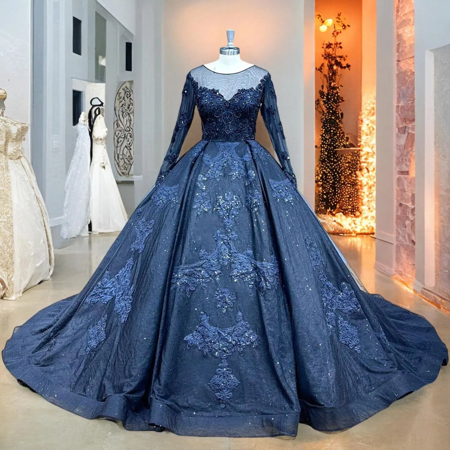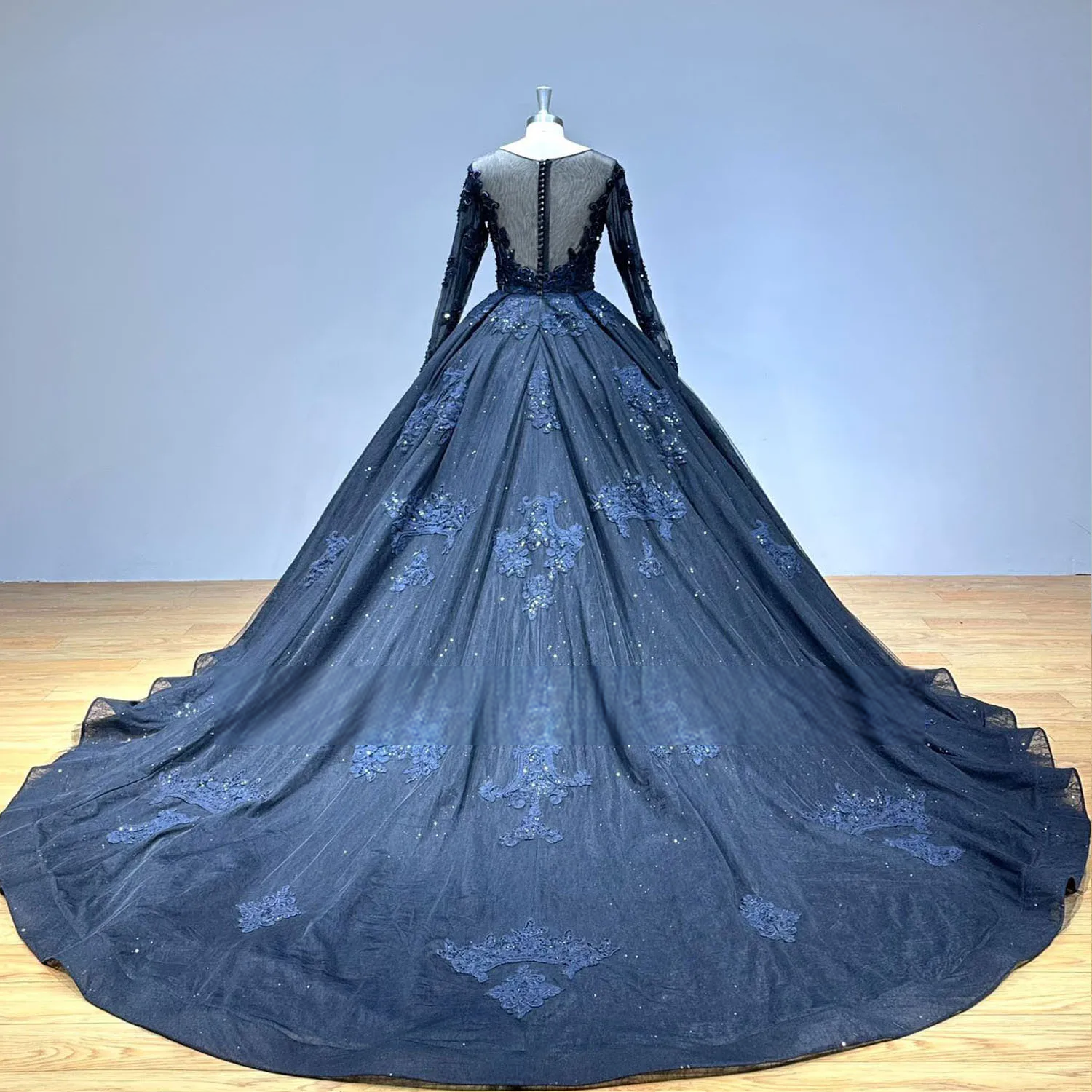Black Ball Gown Wedding Dress with Long Sleeves Pearls Beading and Lace Appliques