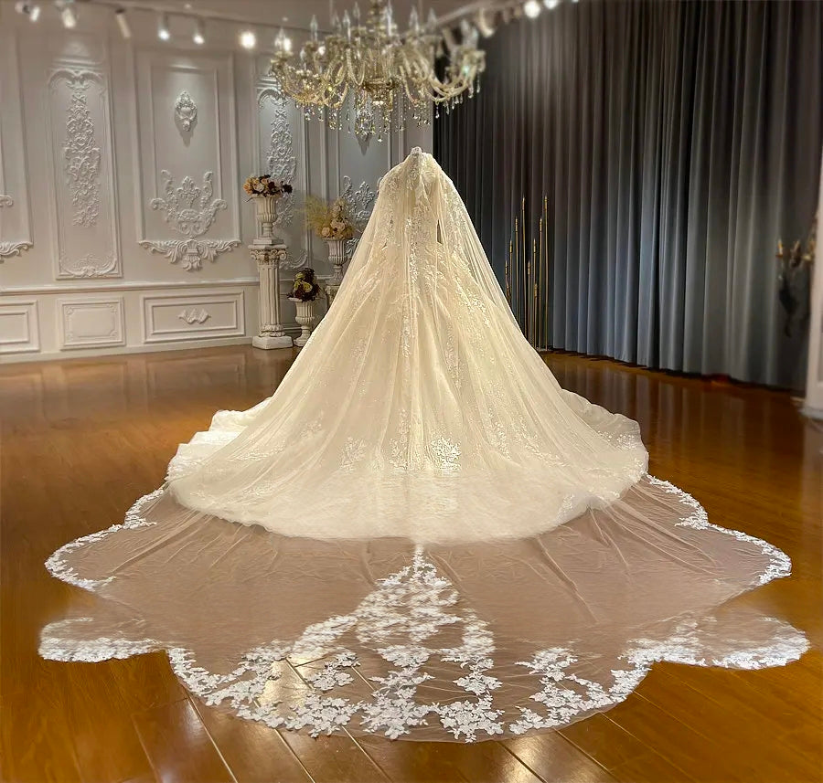 Make a grand entrance in this Champagne Full Lace Ball Gown Wedding Dress with Long Sleeves, featuring intricate floral lace, a voluminous skirt, and a regal sweeping train. The vintage champagne hue, elegant long sleeves, and fitted bodice create a timeless, romantic look perfect for both grand and intimate weddings.