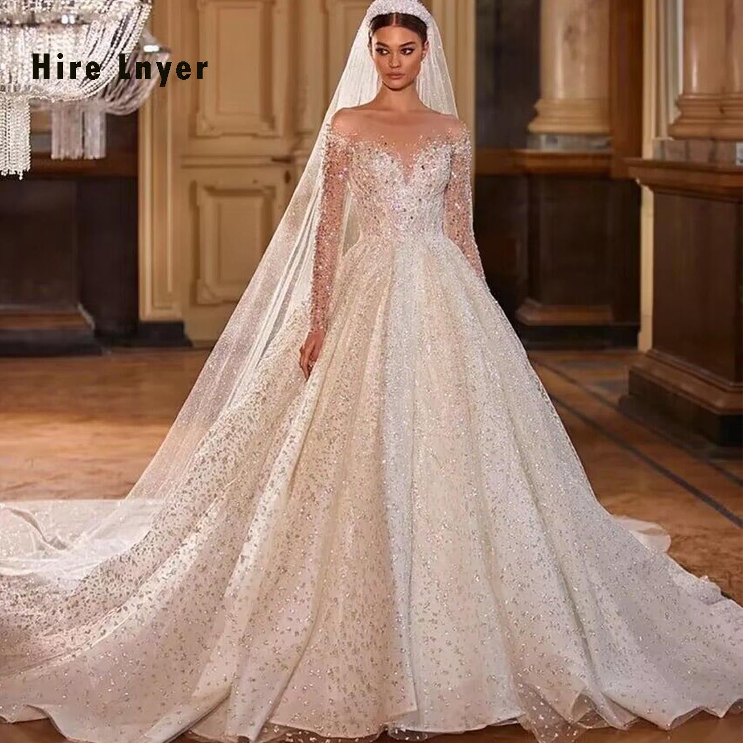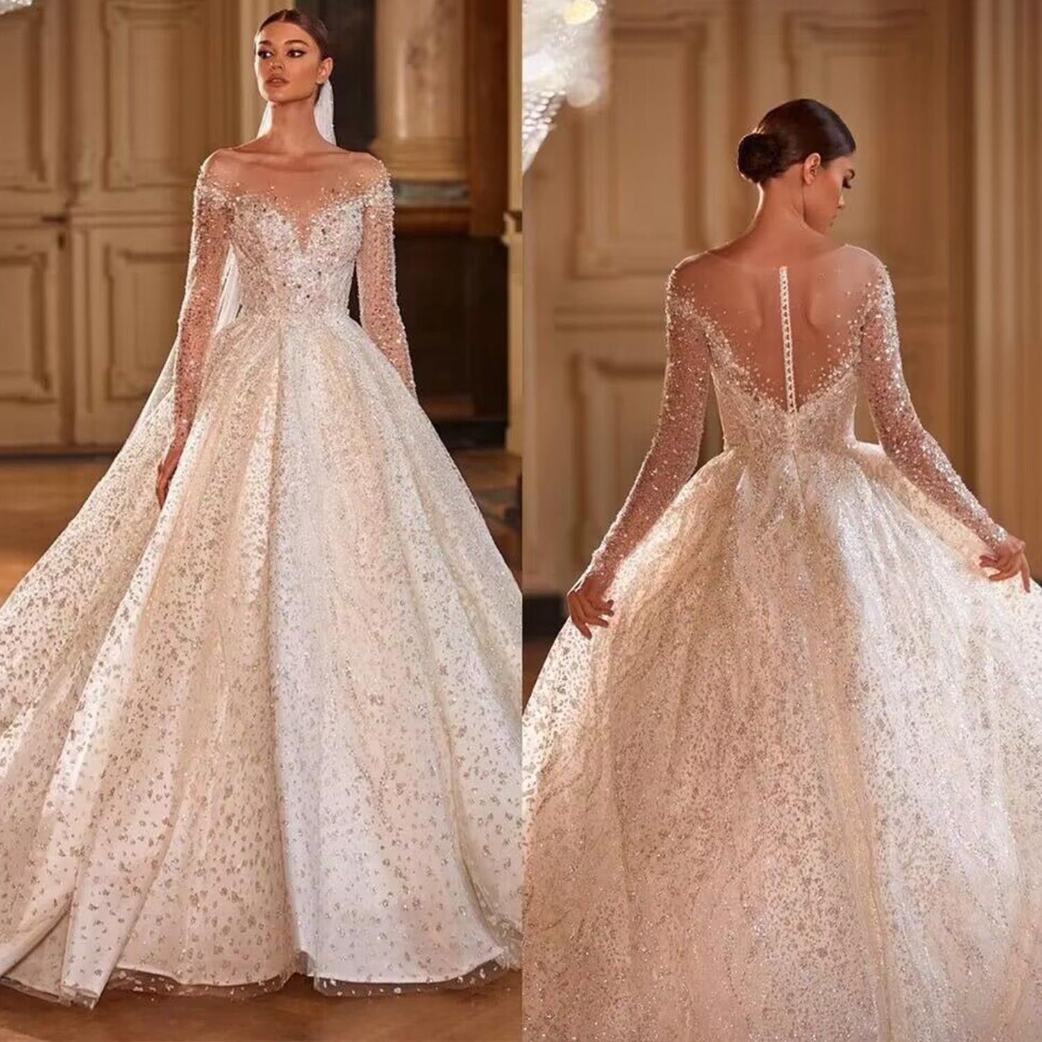 Crystal Beaded Shining Ball Gown Wedding Dress with Long Sleeves and Illusion Back