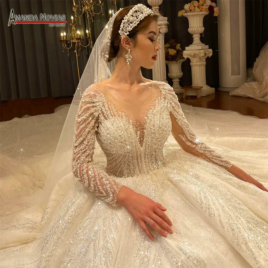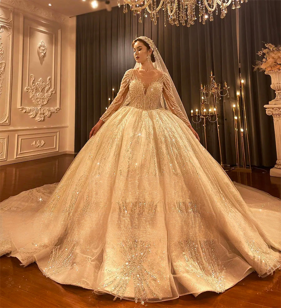 Dubai Style Royal Train Ball Gown Wedding Dress with Long Sleeves