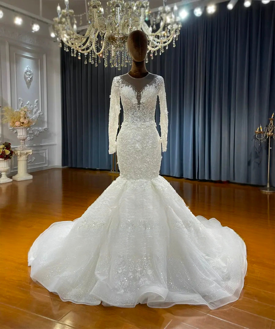 Step into elegance with this New Lace Mermaid Wedding Dress, featuring a fitted silhouette that beautifully accentuates your curves. Delicate lace detailing and a graceful train make it the perfect choice for a romantic, unforgettable wedding day.