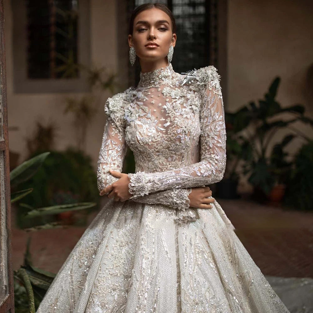 Exquisite High Neck Long Sleeve Lace A-Line Vintage Wedding Dress Luxury Bridal Gown