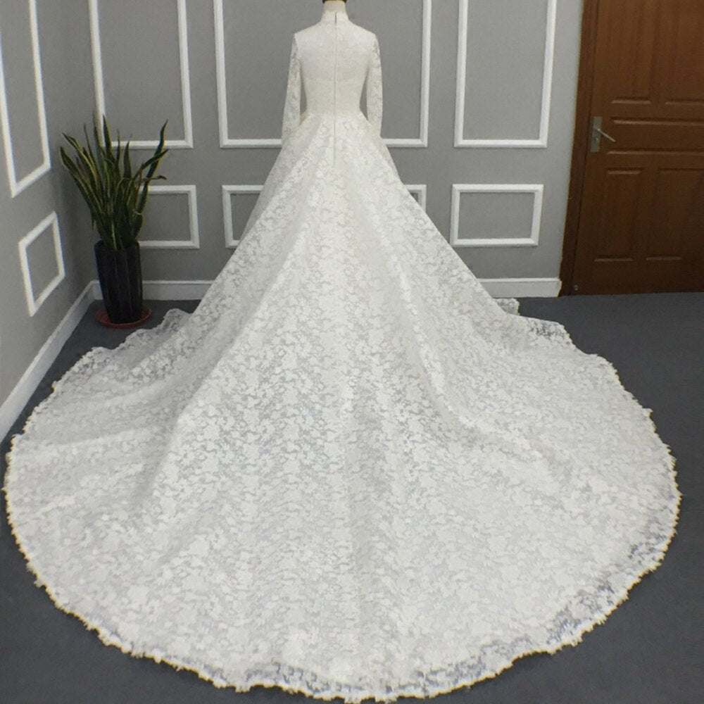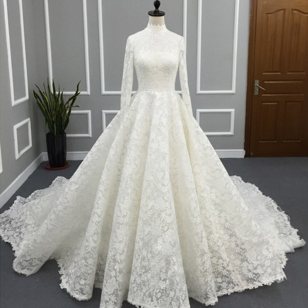High Neck Long Sleeve Princess Lace A-line Muslim Wedding Dress With Petticoat