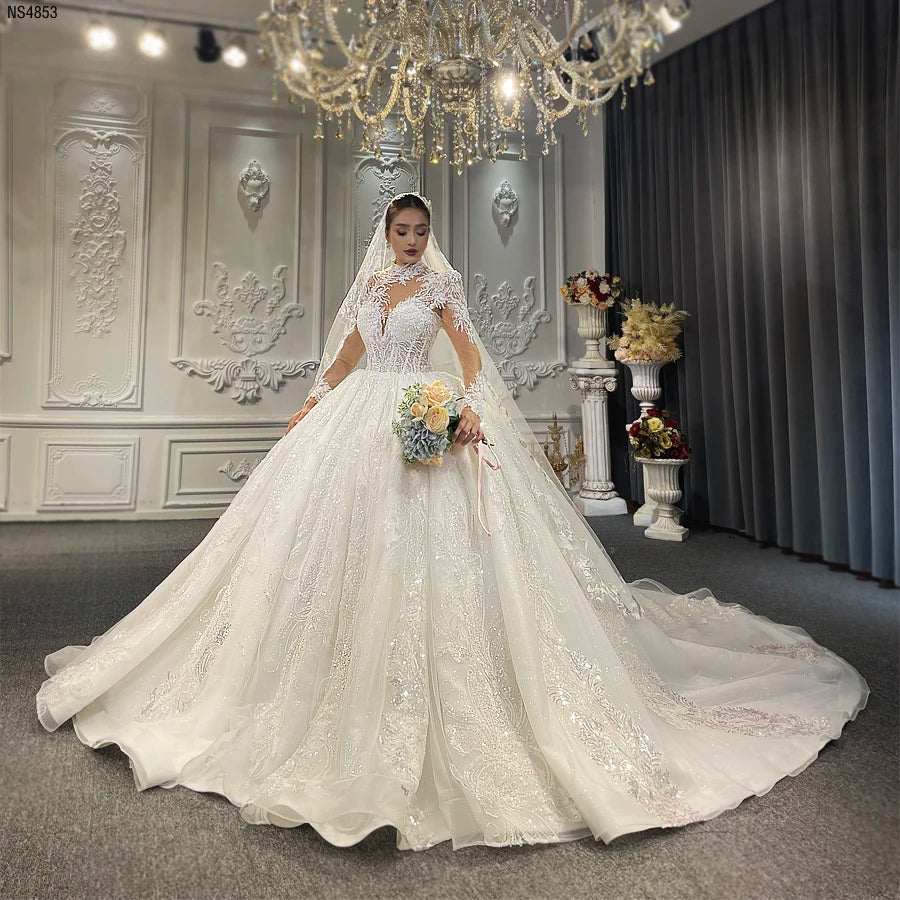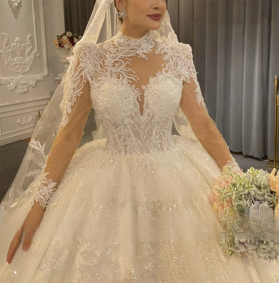 Step into timeless elegance with our High Neckline Lace Wedding Dress, featuring a sophisticated high neckline and intricate lace detailing that creates a romantic, regal ball gown silhouette. Made with high-quality materials for a comfortable, flattering fit, this dress blends classic charm with modern refinement—perfect for any wedding style and setting.