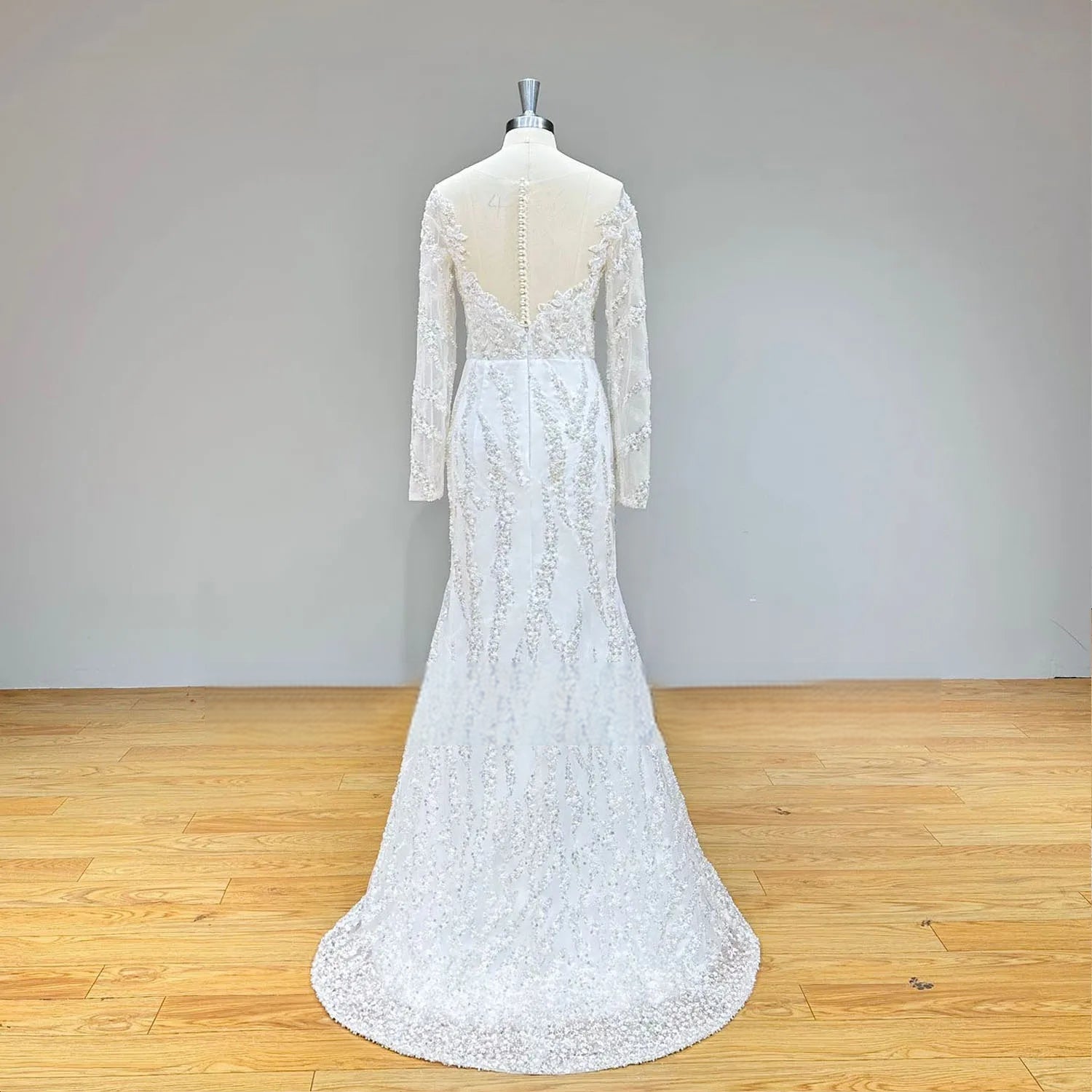 Shiny Beaded Pearls Sequins Long Sleeve Wedding Dress with Detachable Skirt and Slit