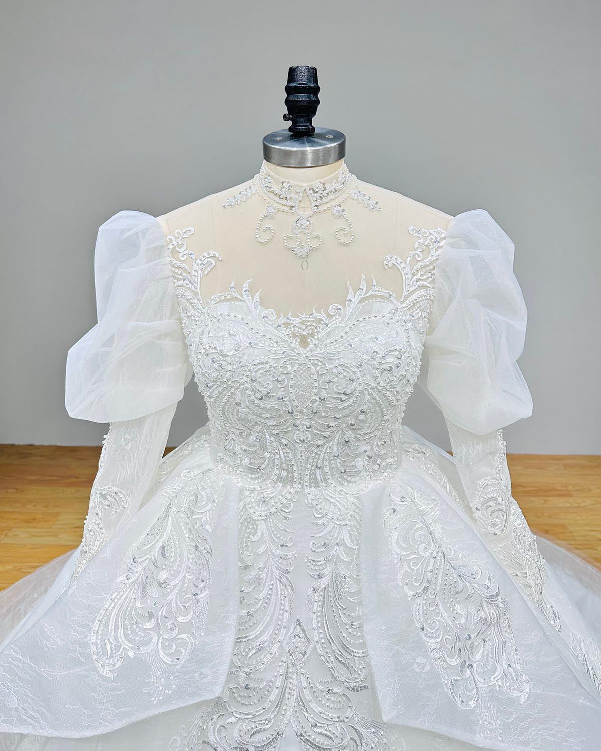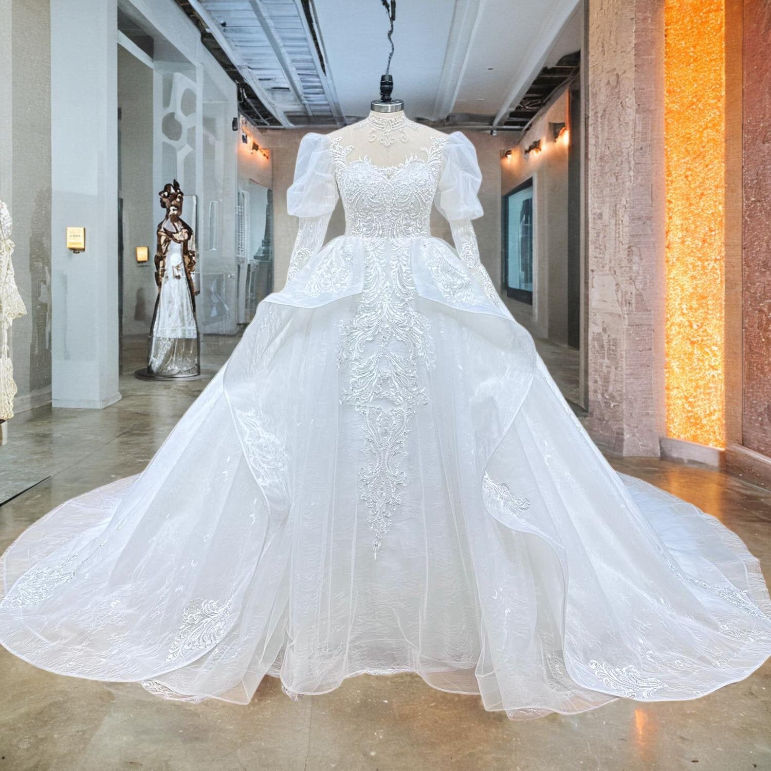 A timeless blend of elegance and grandeur, this high neck puff sleeve ball gown features exquisite beaded lace detailing. Perfect for a statement-making bride, it offers regal charm and unmatched comfort.