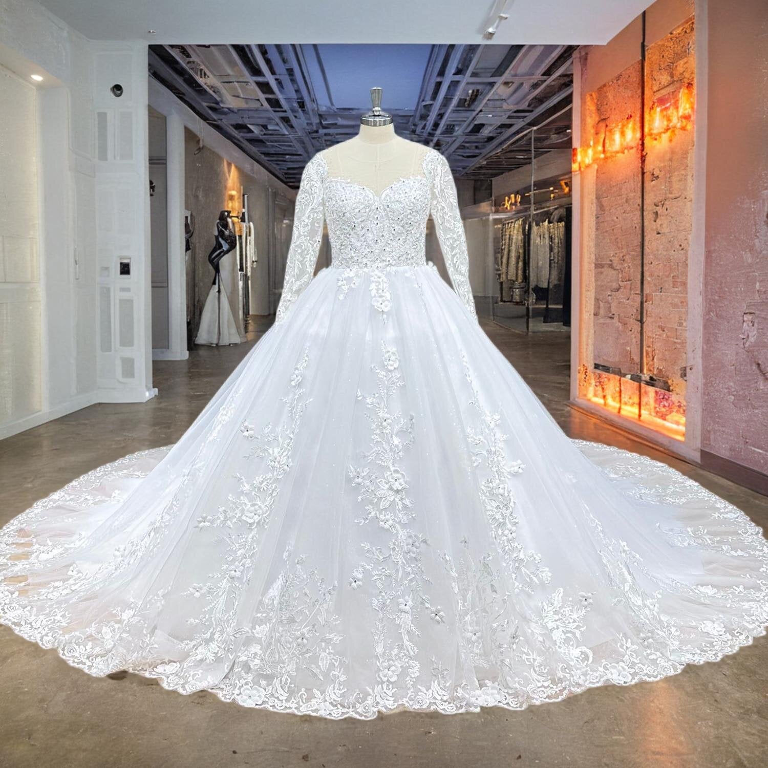 Make a grand entrance in the Hire Lnyer Long Sleeve Beaded Ball Gown, adorned with shimmering beadwork and a sweeping train. This timeless gown blends elegance and sophistication for your unforgettable wedding day.