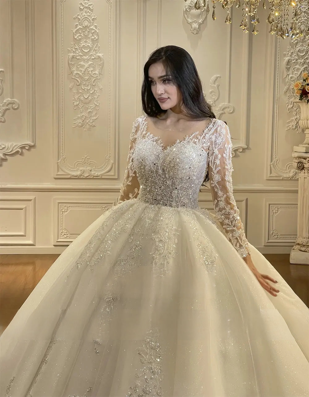 Elevate your bridal look with our Hot Sale Real Sample Ball Gown Bridal Dress featuring long sleeves, a voluminous silhouette, and intricate detailing for timeless elegance. Perfect for grand celebrations, this luxurious gown blends comfort and sophistication, making your wedding day truly unforgettable.
