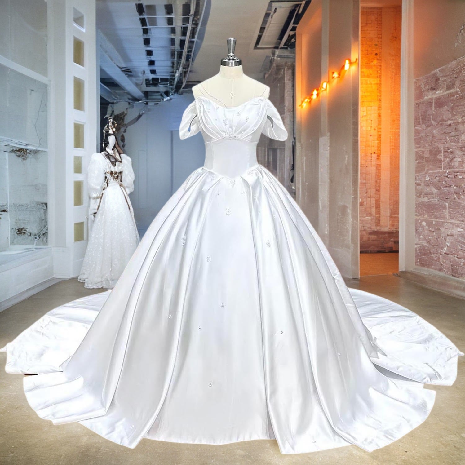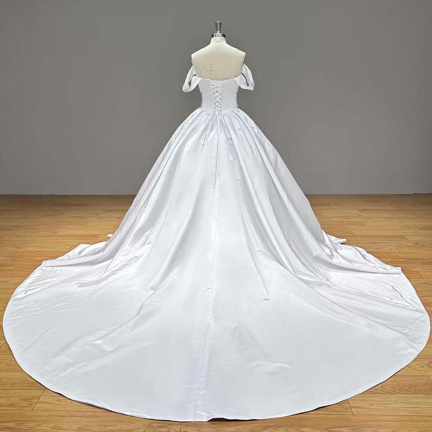 Crafted from high-quality satin with a soft light effect, this ball gown exudes elegance without excessive shine. The off-shoulder design, pleated details, and lace-up back create a timeless, flattering silhouette perfect for any bride.