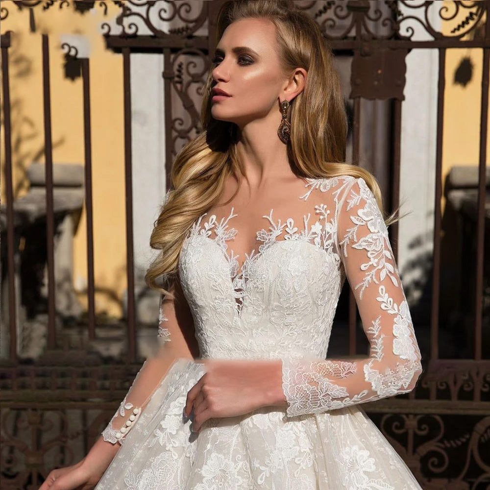 Long Sleeve A-Line Sexy Illusion Lace Wedding Dresses Elegant Appliques Court Bridal Gown