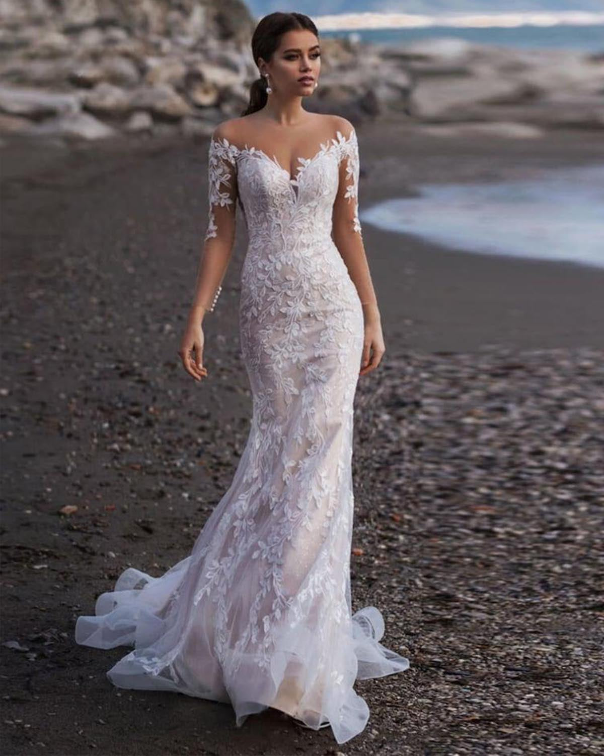 Our Long Sleeve Mermaid Wedding Dress combines vintage charm and modern elegance with an O-neck, delicate sleeves, and a stunning illusion back that flatters your curves. Crafted from premium fabrics with intricate details, it promises timeless beauty and confidence on your big day.
